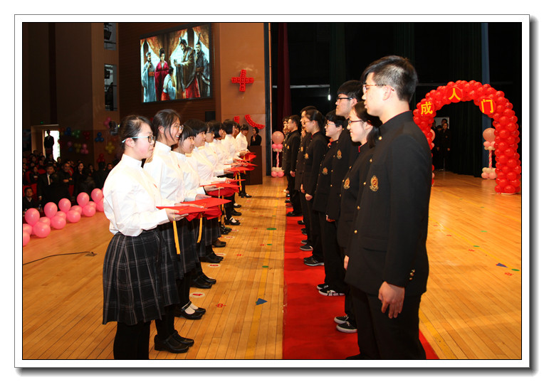 伴着一首《和你一样》,高一的同学们手托蜡烛翩翩起舞,为成人仪式揭开了序幕。在全场参会人员唱完雄壮的国歌之后,教育局周燕来副局长为大会作了热情洋溢的致辞,表达了对年满18岁的高三学子的祝贺和期望。一段汇集了同学们成长足迹的老照片回顾,让在座的同学感慨万端。在行加冠礼之前,语文教研组长李双老师为同学们介绍了古代的冠礼笄礼仪式,带同学们体悟几千年的传统礼仪内涵。