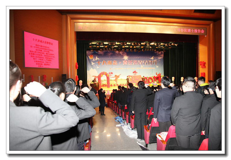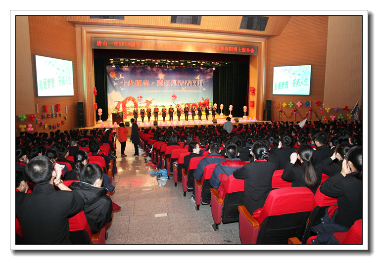 3月6日下午3点,“唐山一中2014级学生18岁成人宣誓大会暨优秀校友郑春阳博士报告会”在唐山一中礼堂隆重举行。唐山一中94届校友郑春阳博士、唐山市总工会主席刘建国、唐山市科协主席王保国、唐山市妇联主席张进霜、唐山市科技局局长吕素青、唐山市委宣传部副部长文明办主任李丽、唐山市教育局周燕来副局长、唐山市开平区副区长杨艳辉、唐山广播电视台副台长孙宪章、唐山市开平区教育局局长李向东、唐山团市委学少部部长李丽等都应邀出席了此次活动。唐山一中团委书记赵雅君主持了本次大会。
