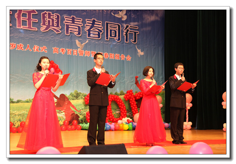 在这个特殊的日子,孩子们收到了好多份让他们惊喜又感动的生日礼物——来自老师们的视频祝福,来自家长代表宋晓梅女士和教师代表何艳超老师的现场祝福,一本由班主任老师亲自交到手里的《成人纪念册》,一首由高三教师们深情朗诵的诗歌,来自刘长锁校长的生日寄语,还有优秀校友郑春阳博士的现场励志报告!这是一个让孩子们终身难忘的生日,他们深深懂得这一份份厚礼中蕴藏着的浓浓深情和殷殷期盼。精英班陈天成同学代表全体年满18岁的学生表达了对父母、老师和学校的感恩,并表示在新的人生征程上学会“感恩”,努力“成长”,担当“责任”!一首激情昂扬的《十八岁赞歌》,把大会推向了高潮。带着激动澎湃的心情,学生会主席王曼琪带领高三全体年满18岁的同学面对国旗庄严宣誓。最后,高三学生以班为单位进行了慷慨激昂的“高考誓师”,全场热血沸腾、豪气干云。