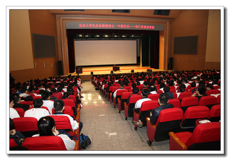 4月13日,唐山一中本学期第一次“名家进校园课程”有幸请来了北京大学中文系孔庆东教授,本次报告的题目是《有侠有仁是青春》。孔教授是孔子第73代传人,北京大学中文系博士,现任北京大学中文系教授,主攻中国现当代文学,兼及思想文化评论。著有《47楼207》、《空山疯语》、《黑色的孤独》、生活的勇气》、《脍炙英雄》、《四十五岁风满楼》等文集、选集。在多家电台电视台和多所大专院校设坛讲授金庸武侠小说,在央视百家讲坛开讲金庸和鲁迅。并出版《正说鲁迅》。