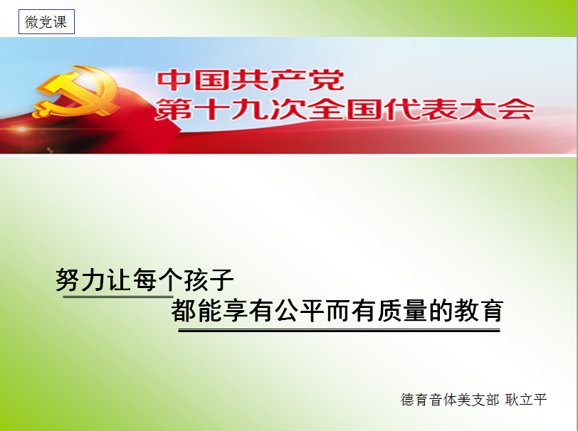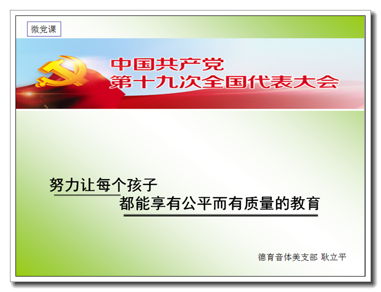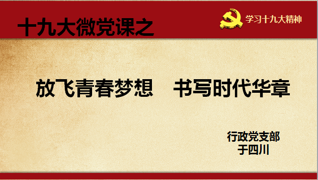 十九大召开之后,我校迅速掀起了学习十九大的热潮,开展了独具特色的“五个一”学习活动,即一场报告会、一次微党课、一封“党员教师的信”、“一次分层推进的广泛学习活动、一次征文或演讲比赛”。活动开展以来,得到了学校老师和同学们的积极响应,取得了非常好的活动效果,营造了学起来、教起来、传起来、研起来、干起来、实起来的良好氛围。