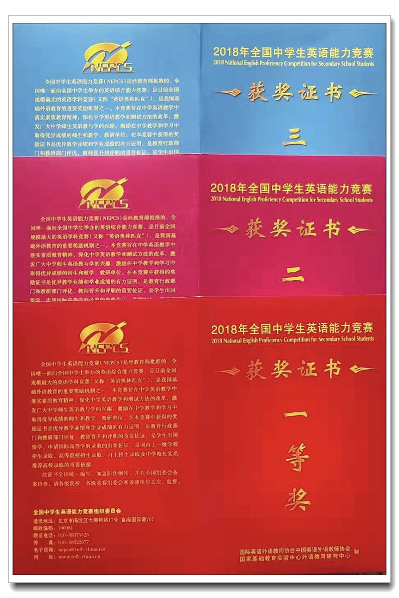 在结束的2019年全国中学生英语能力大赛中,我校共获得: