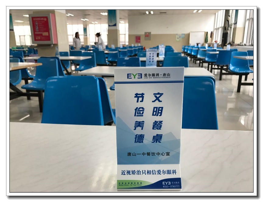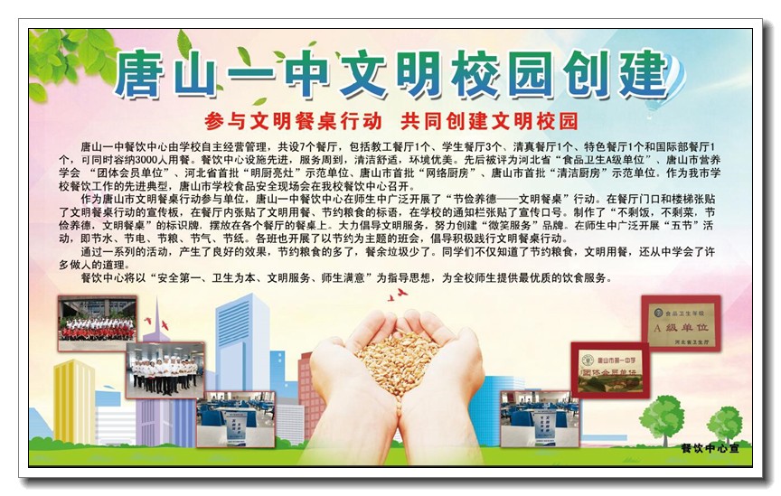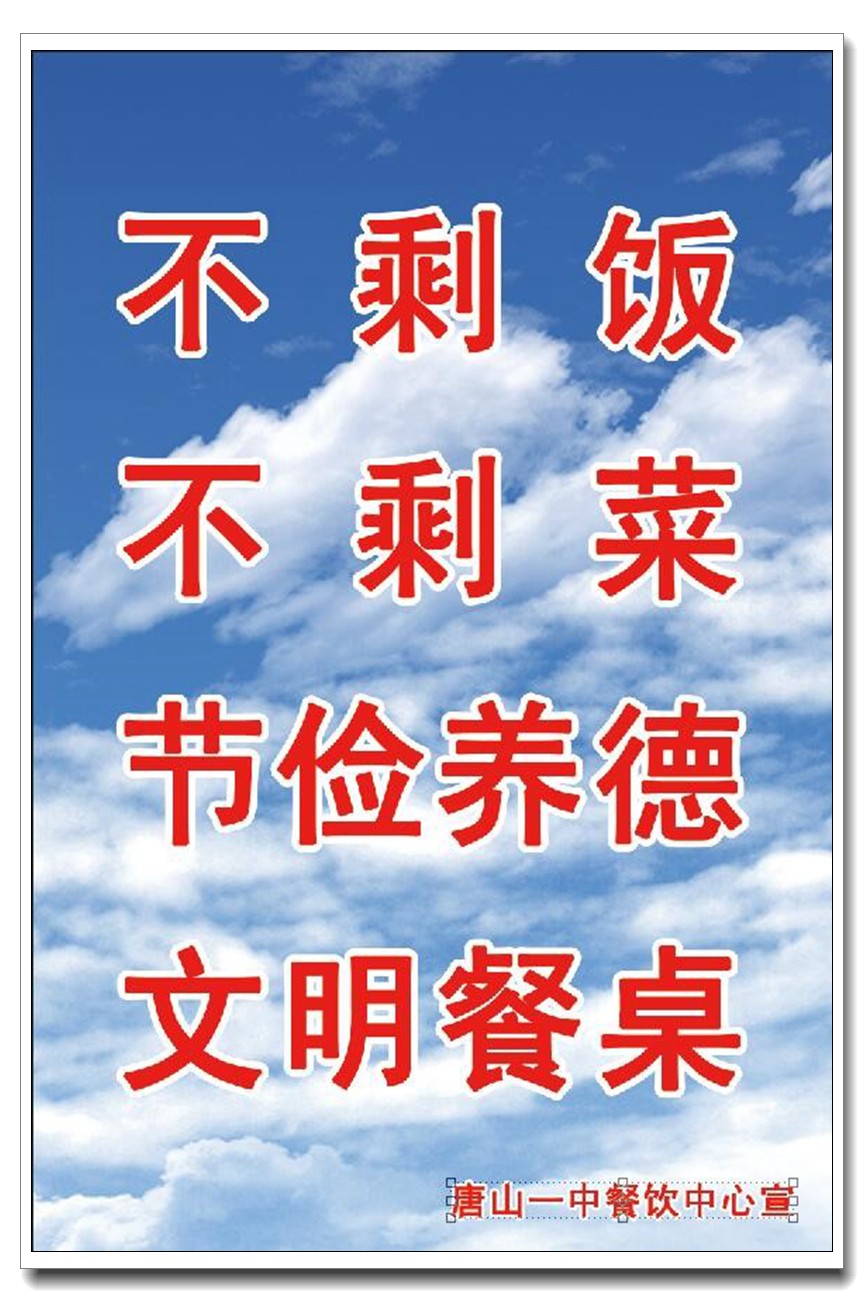 3、开展了校园“文明餐桌”活动的宣传教育活动。一是在餐饮中心入口处悬挂“唐山市文明餐桌行动参与单位”的铜牌。二是在餐厅门口张贴了文明餐桌的宣传板。三是制作了300个“不剩饭,不剩菜,节俭养德,文明餐桌”的标识牌,摆放在各个餐厅的餐桌上。四是在餐厅内张贴了文明用餐、节约粮食的标语。五是在学校的通知栏张贴了宣传口号。六是在教工和学生中广泛开展“五节”活动,即节水、节电、节粮、节气、节纸。七是各班开展以节约为主题的班会,倡导积极践行文明餐桌行动。