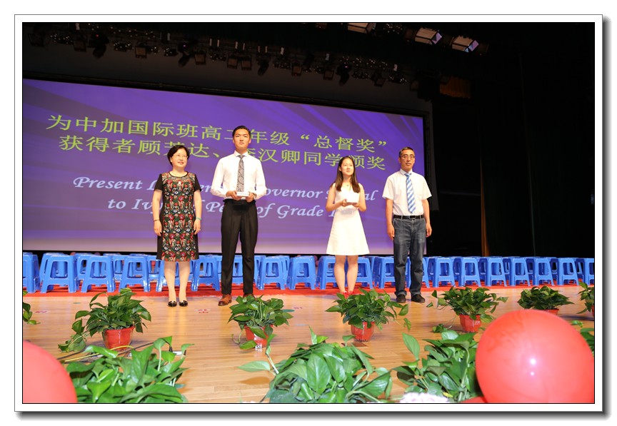 加方校长Mr. Ryan宣读了2019年中加国际班加拿大政府“总督奖”和“伊丽莎白女王奖”的获得者。王卫国书记、丁岚副校长为本年度“总督奖”获得者高二24班顾芳达和高二24班李汉卿颁发了奖章;刘长锁校长、Ryan校长为本年度“伊丽莎白女王奖”获得者高三23班李少元颁发了奖章。