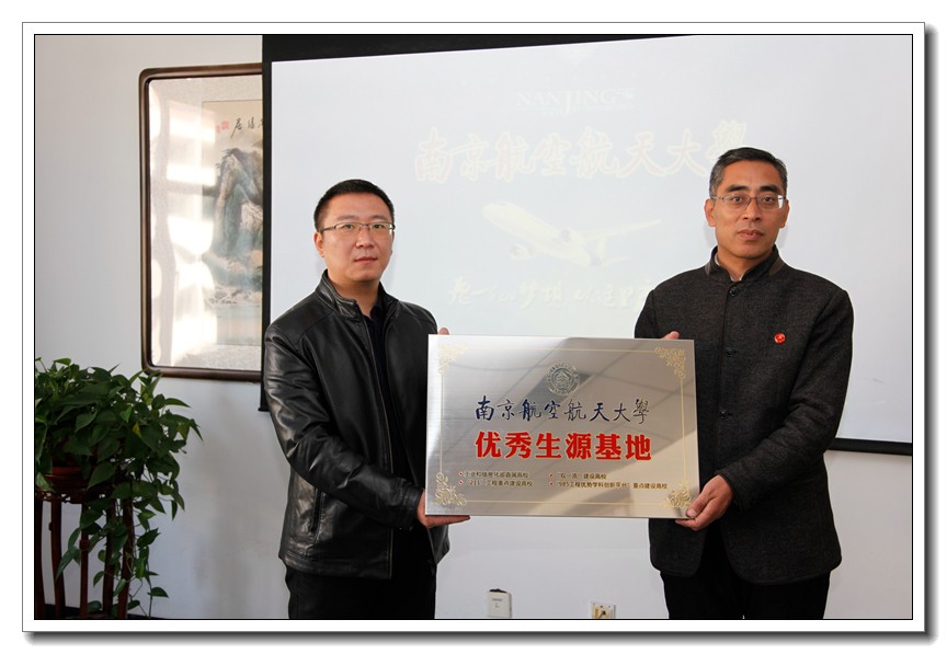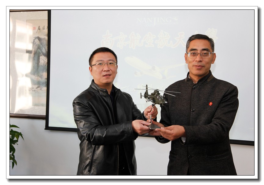 11月15日,南京航空航天大学学生处副处长、招生办主任宋凯、民航学院(飞行学院)招飞与管理办公室主任、学生处招生办副主任赖少将和招生办老师黄博伟一行三人莅临我校,专门为我校的优秀生源基地进行换牌,并赠送给我校代表南航先进科技水平的武装直升机模型。我校王卫国书记出席换牌仪式。