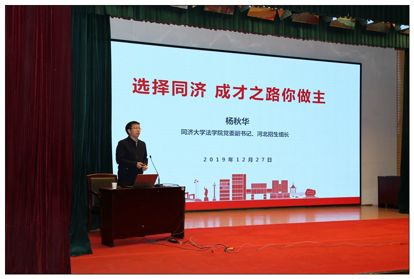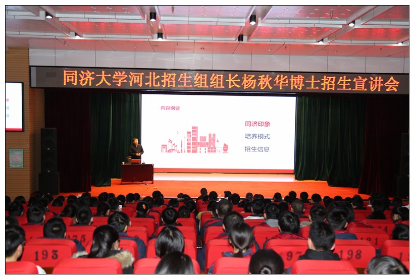 岳教授报告会进行的同时,河北招生组组长杨秋华博士在报告厅为高三部分优秀生和家长进行了招生宣讲。杨老师的讲解主要分为三个部分:同济印象、培养模式和招生信息,从地理环境、建校历史、办学理念、人文情怀、综合实力等方面向与会者全方位的展示出同济大学的各项优势。关于如何应对新高考形式下的大类招生,以及近几年河北省录取情况的分析,给备战2020年高考的学生们提供了更多思路。