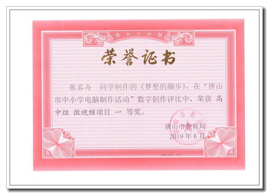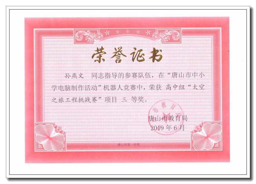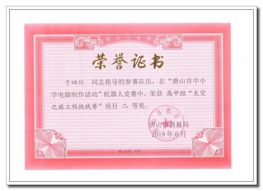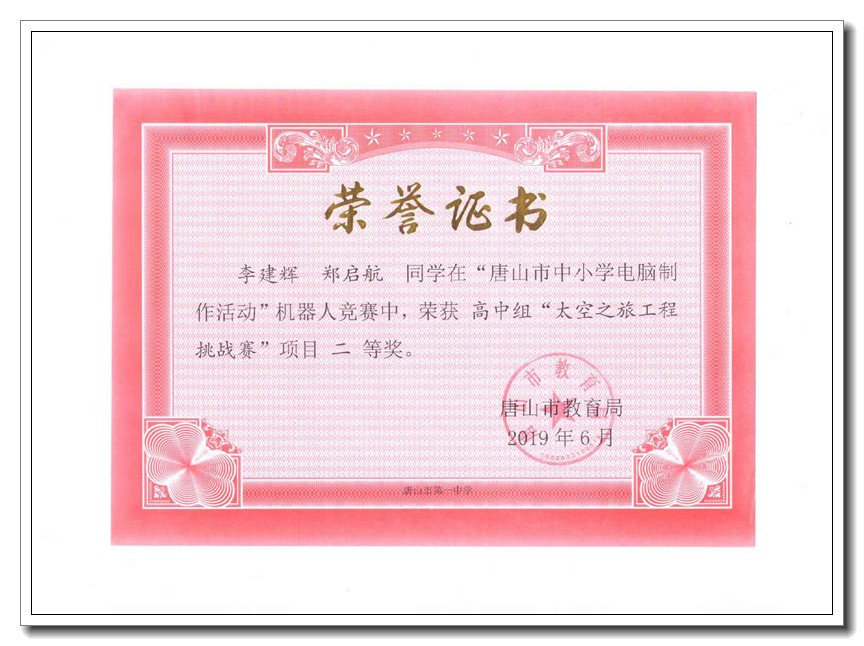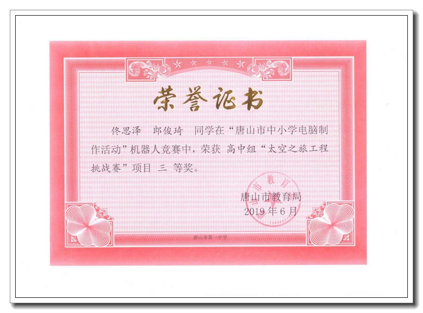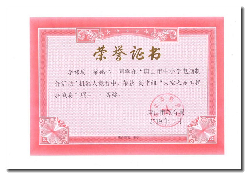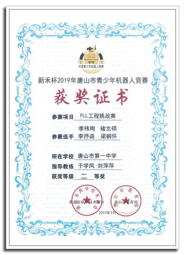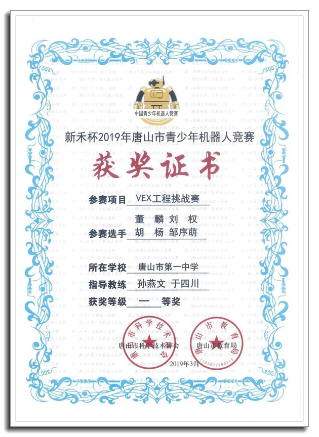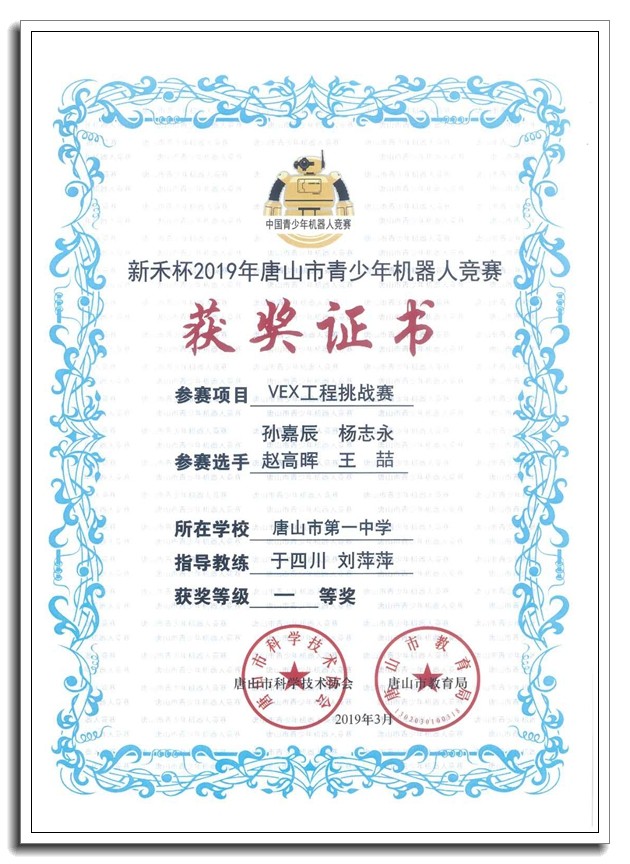 (1)2019年3月9日上午在唐山(新禾智能科技有限公司) 百川大厦,举行唐山市青少年机器人竞赛,VEX机器人工程挑战赛“反败为胜”孙嘉辰,杨志永,赵高晖,王喆,获得市第1名,董麟、刘权、胡杨、邹序萌获得第2名。