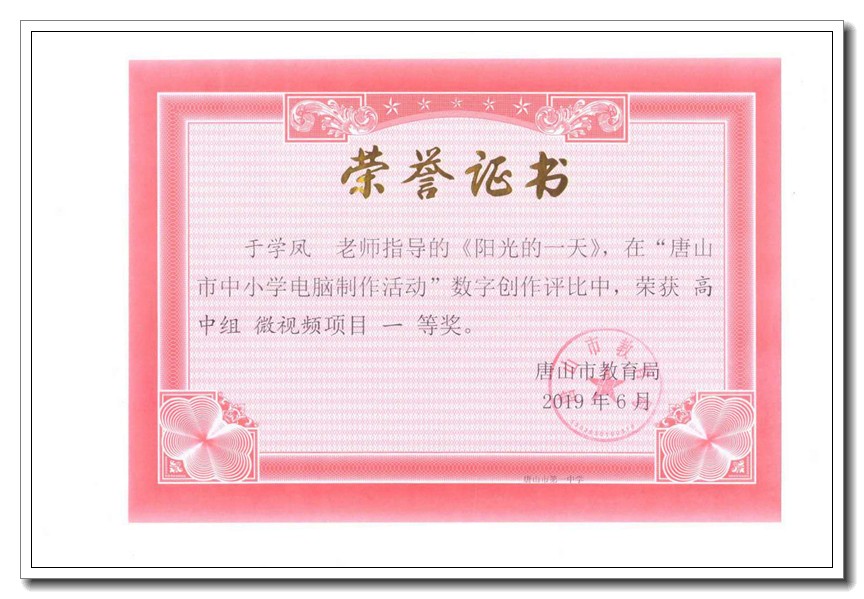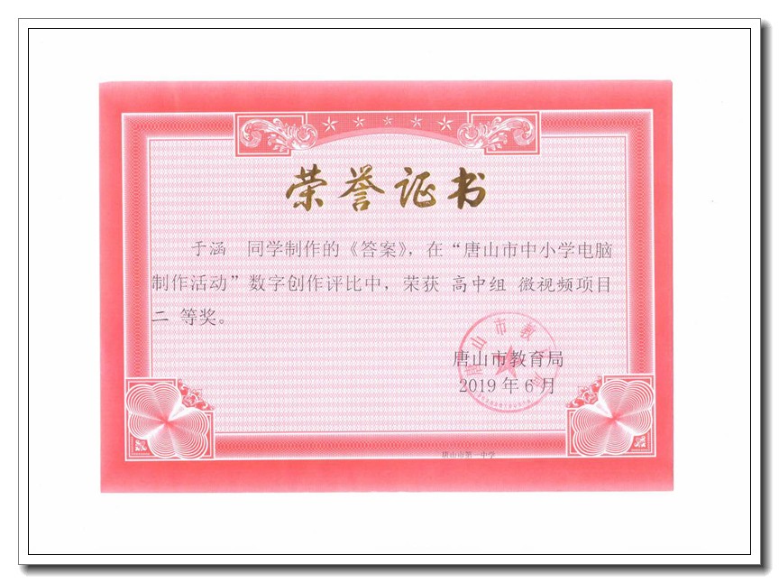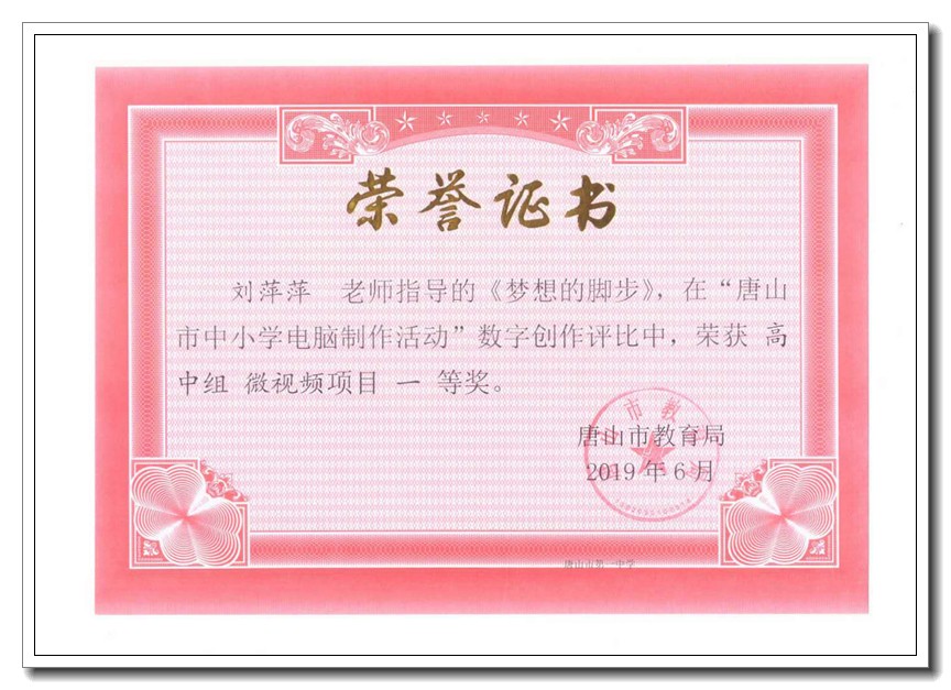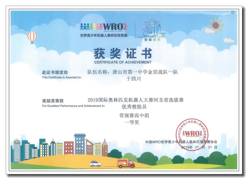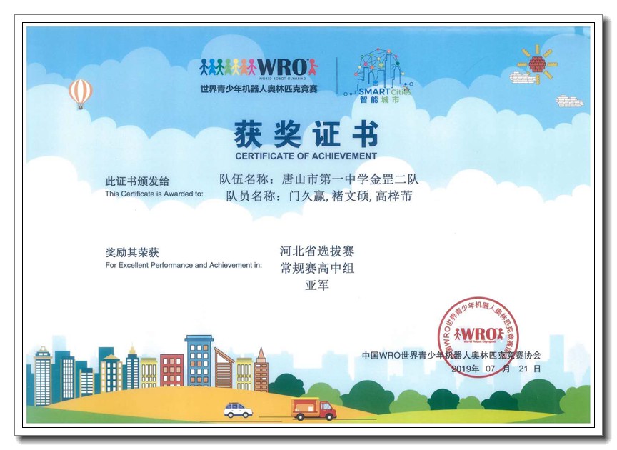 (4)2019年7月WRO世界青少年机器人奥林匹克竞赛河北省选拔赛上郑喜颖、刘淮嘉、岳洪堃获高中组一等奖;门久赢、褚文硕、高梓芾获高中组亚军。