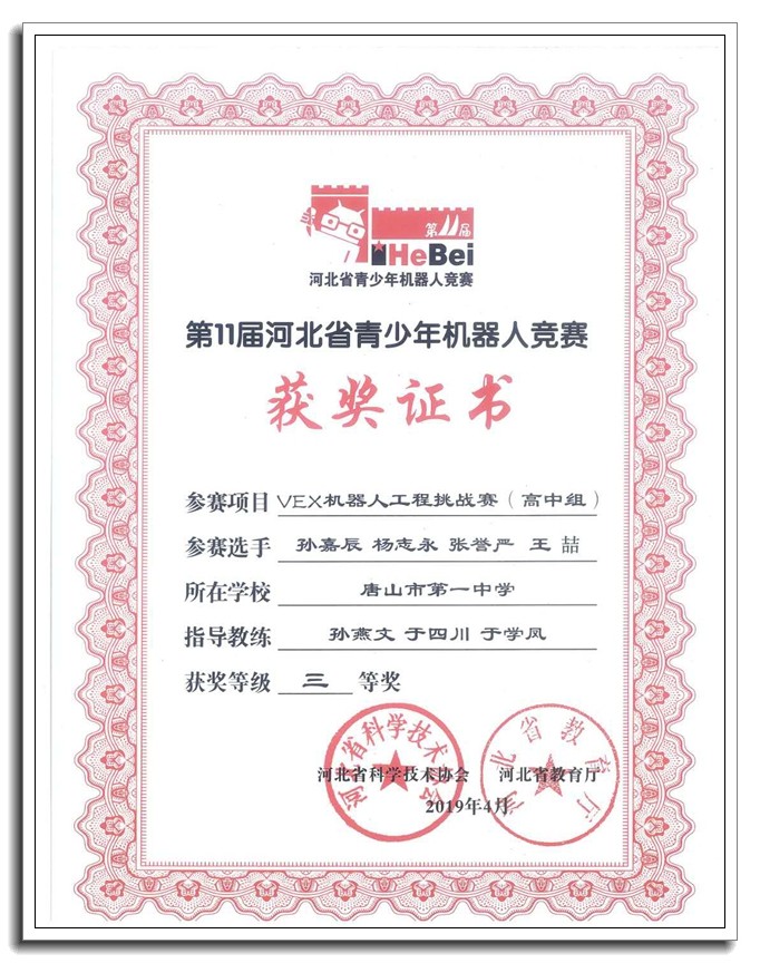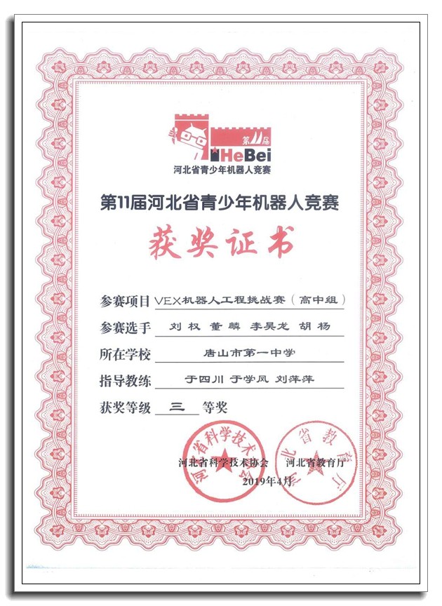 (3)2019年4月20日至21日,第11届河北省青少年机器人竞赛在廊坊举行,孙嘉辰,杨志永,张誉严,王喆,刘权,董麟,李昊龙,胡杨,获得省三等奖。