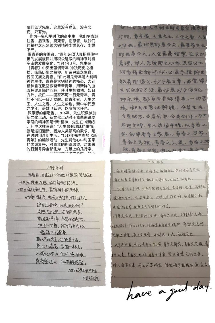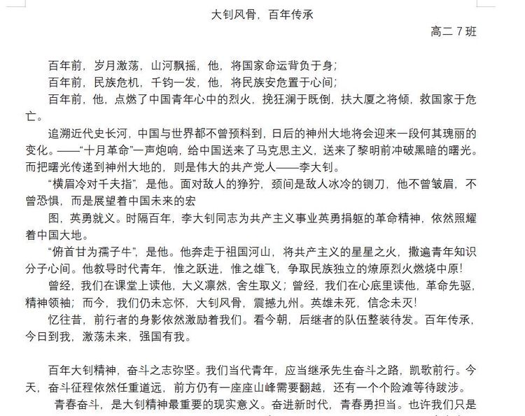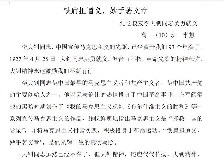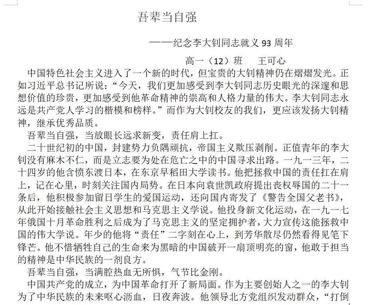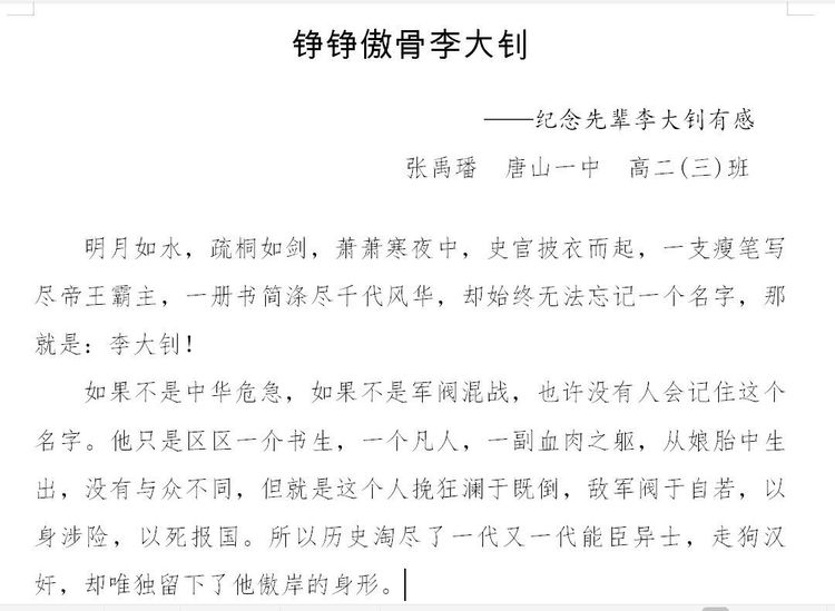 在今年特殊的疫情防控期间,为缅怀大钊精神,继承先烈遗志,唐山一中团委开展了主题为“传承大钊精神、恢宏志士之气”的网络纪念活动。团委利用微信群组织各班学生开展纪念大钊就义征文活动,同时鼓励各班组织多种形式纪念活动如传抄大钊诗词,朗诵大钊诗词等。