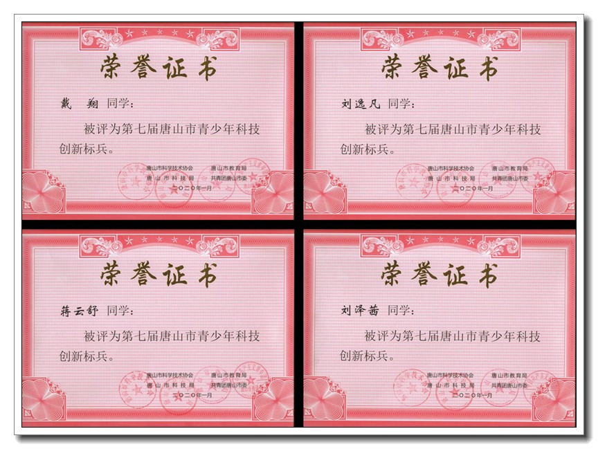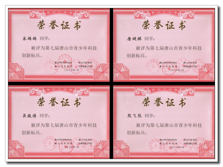 在2020年初的第七届评选活动中,我校高三年级吴骏源、宋端端、刘泽茜、唐健祺、刘逸凡、蒋云舒、戴翔和熊飞熊等8名同学凭借出色的创新项目,获得评审委员会的一致认可,从众多申报者中脱颖而出,获得了“唐山市第七届青少年科技创新标兵”荣誉称号。