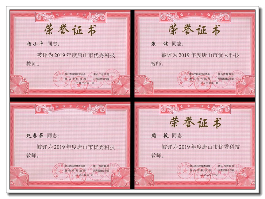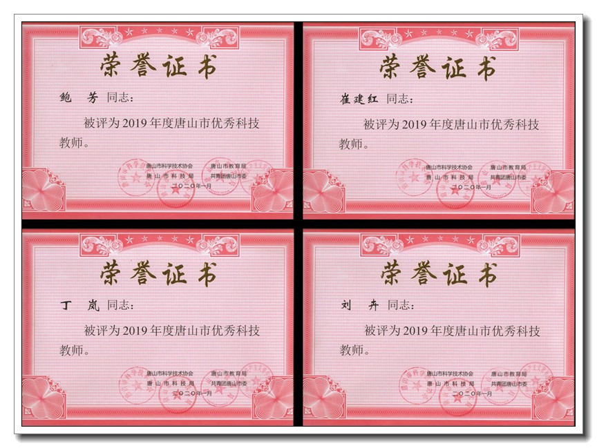 同时,我校鲍芳、崔建红、丁岚、刘卉、杨小平、张健(女)、赵春蕾和周敏8位老师在组织、策划、指导青少年科技活动中成绩显著,辅导学生参加上年度青少年科技类竞赛获得省级一等奖及以上,被市科协、市教育局、市科技局和团市委联合授予“唐山市优秀科技教师”称号。