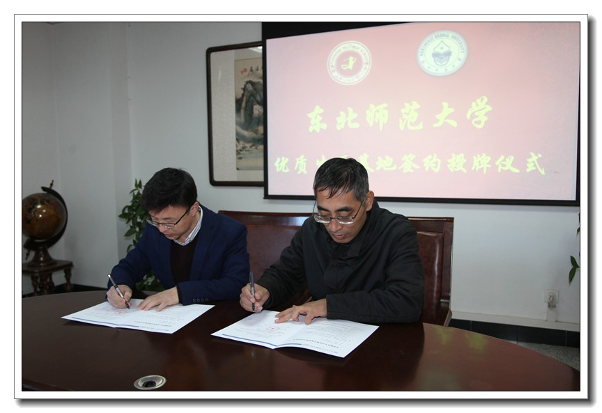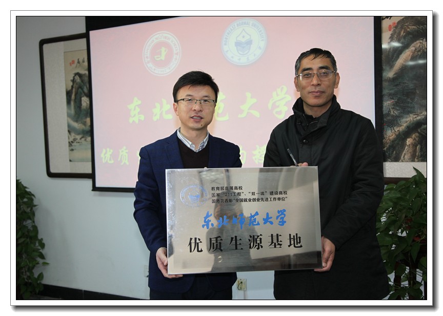 会谈结束后,王卫国校长与马骥主任共同签署了《东北师范大学优质生源基地合作协议书》,马主任代表该校为我校授牌,双方在亲切友好的气氛中合影留念。