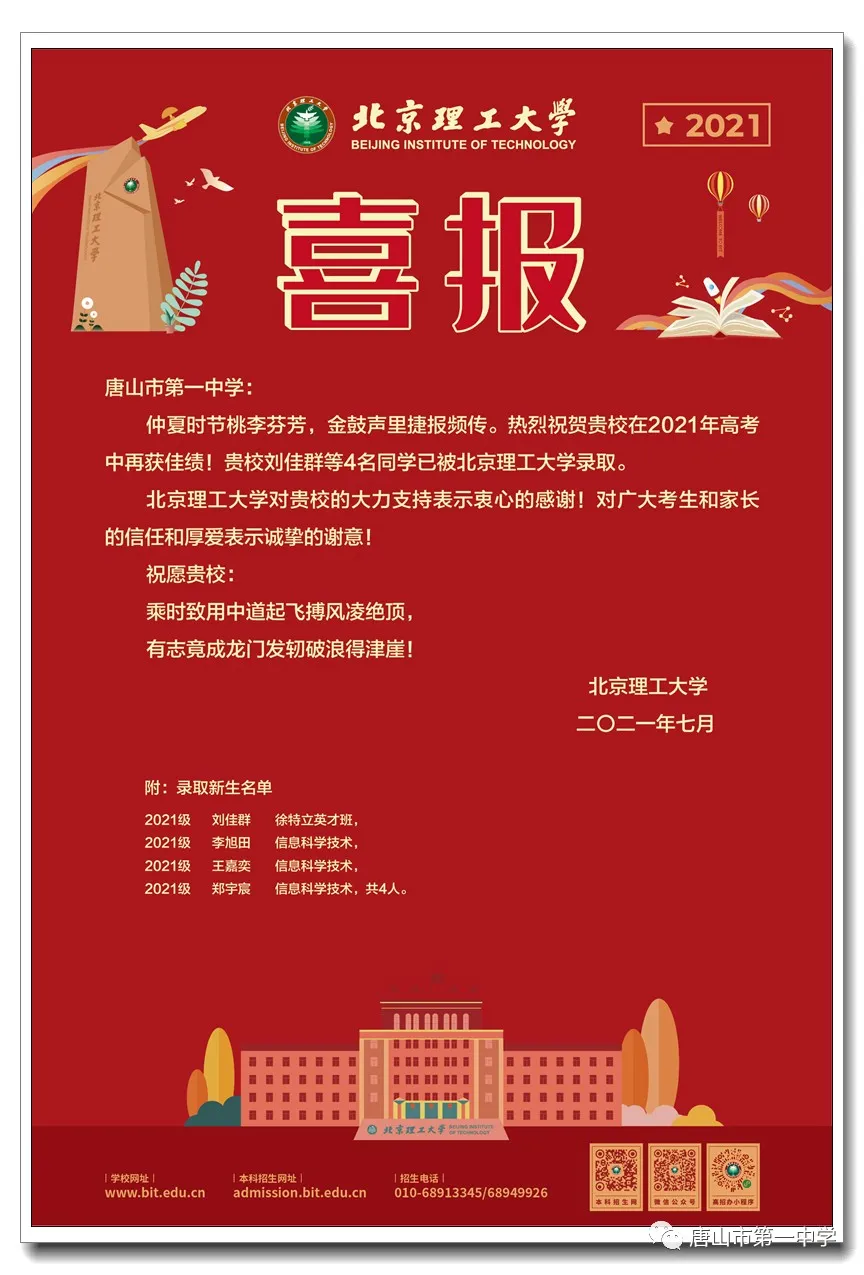 仲夏时节桃李芬芳,金鼓声里捷报频传。近日,北京理工大学发来喜报,我校2021届毕业生刘佳群、李旭田、王嘉奕、郑宇宸、伦伊玮等五位同学已顺利录取北京理工大学。在此,特向五位同学表示热烈祝贺!并祝愿他们在北理的广阔天地中精进学业、全面发展!