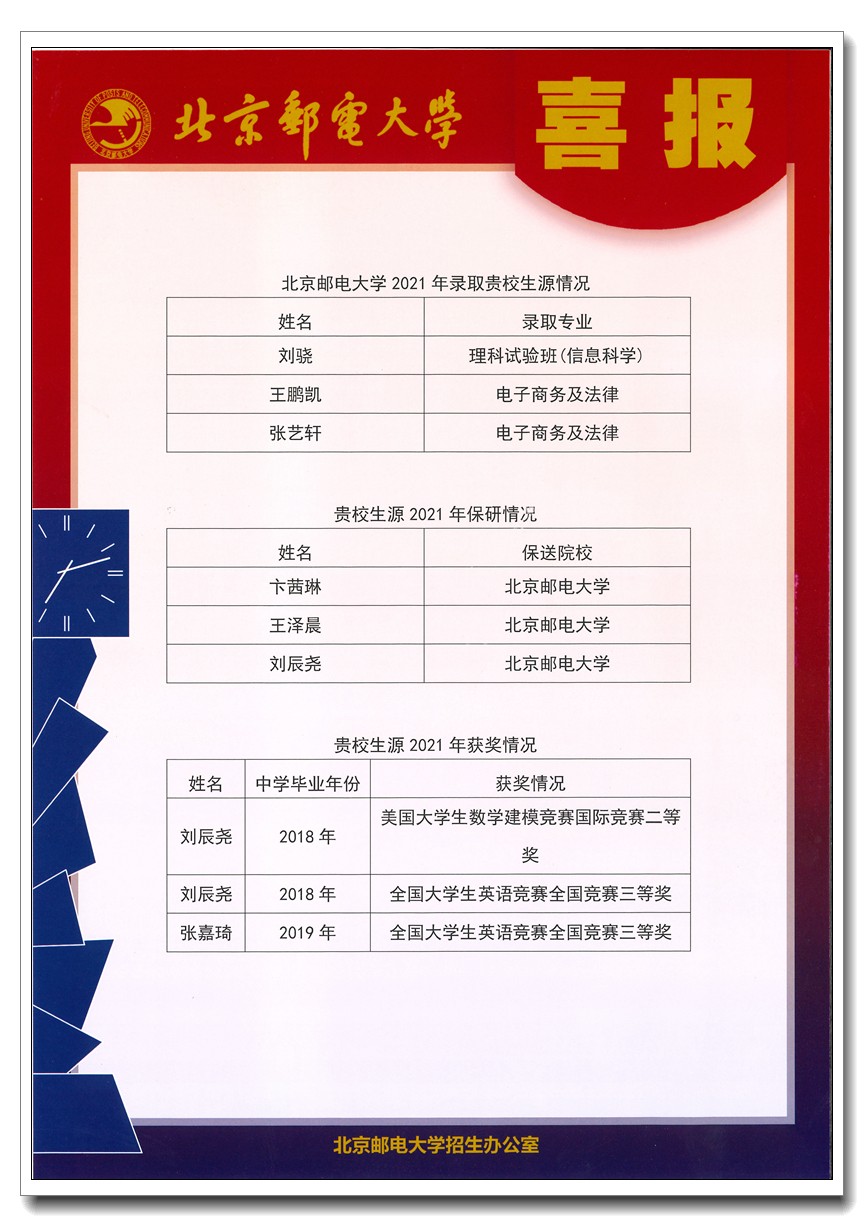 近日,北京邮电大学向我校发来喜报,祝贺我校刘骁、王鹏凯、张艺轩、周子茗等四位同学走进北邮,成为新一代的北邮人。同时,我校优秀毕业生在北邮就读期间表现突出、成绩卓越,卞茜琳、王泽晨、刘辰尧、吴静涵四位同学获得保研资格;刘辰尧、张嘉琦两位同学在大学生国际竞赛、全国竞赛中取得优异成绩。我校特向九位同学及他们的班科任老师表示热烈祝贺!祝愿九位同学在今后的学习生活中不忘初心,刻苦努力,再获殊荣!