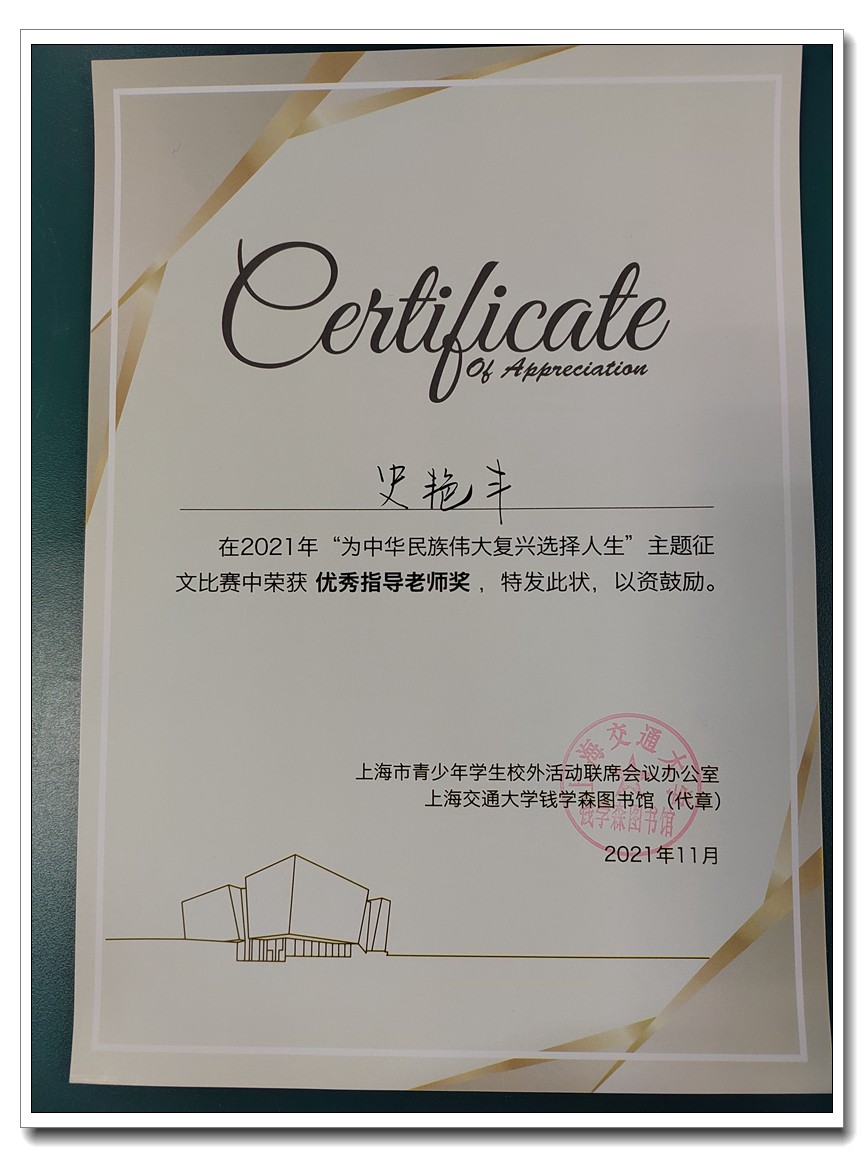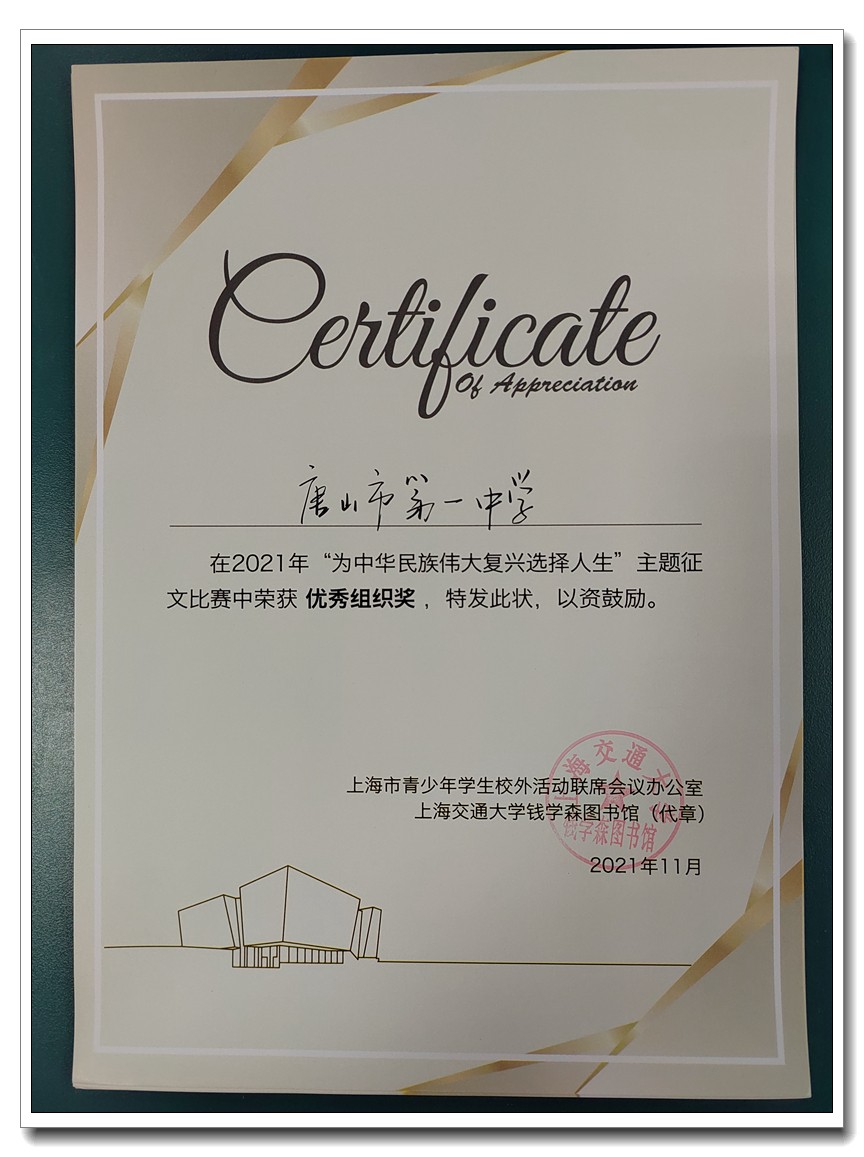 2021年是中国共产党100周年华诞,也是钱学森诞辰110周年,为进一步在大中小学生群体中宣传与弘扬钱学森精神与事迹,培育社会主义核心价值观,中国航天第十二研究院钱学森班工作委员会、上海市青少年学生校外活动联席会议办公室和上海交通大学钱学森图书馆联合举办“为中华民族伟大复兴选择人生”主题征文活动。我校师生积极参与,踊跃投稿,喜获佳绩——翔云中学高三(1)班赵伊宸同学获得高中组特等奖;唐山一中高二(17班)“钱学森班”五位同学获高中组奖项:戴嘉瑶同学获得“一等奖”,董政达同学获得“二等奖”,董易伦、魏映煊、王嘉耀同学获得“入围奖”;史艳丰老师荣获“优秀指导老师奖”;唐山市第一中学荣获“优秀组织奖”。