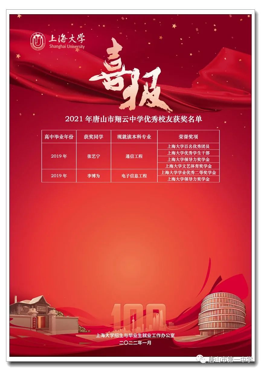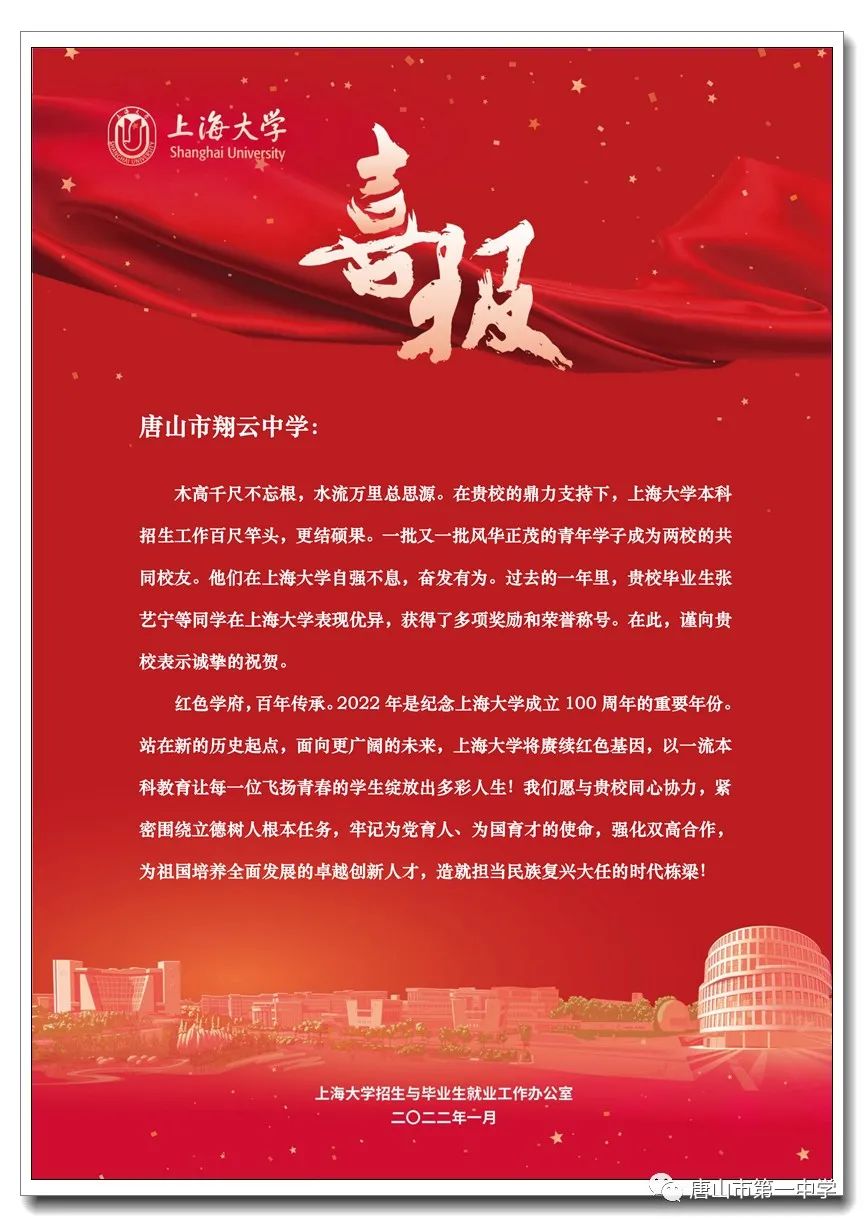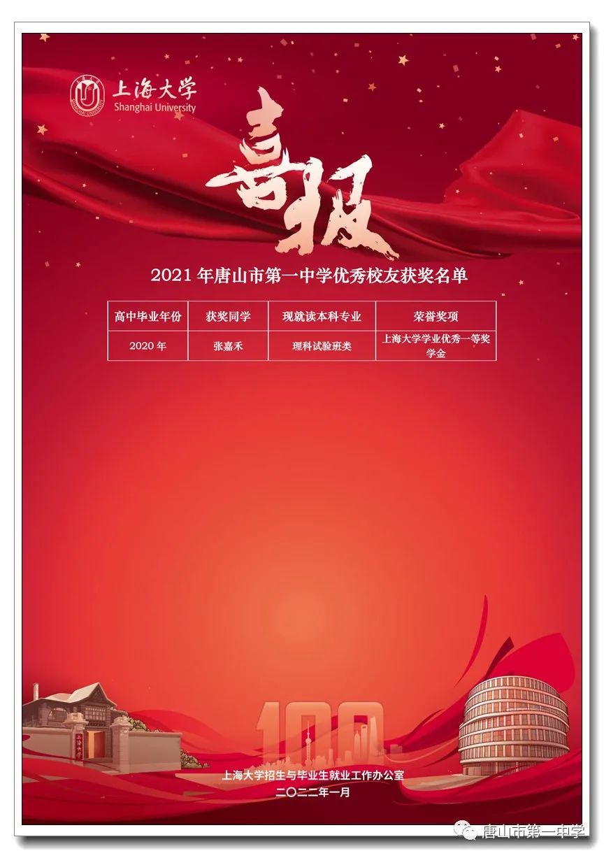 近日,上海大学向我校发来喜报,诚挚祝贺我校优秀毕业生张嘉禾获得上海大学学业优秀一等奖学金;张艺宁获得上海大学百名优秀团员、优秀学生干部、领导力奖学金、文艺体育奖学金;李博为获得上海大学学业优秀二等奖学金、领导力奖学金。我校特向3位同学及他们的班科任老师表示热烈祝贺!向辛勤培育他们的上海大学表示感谢!