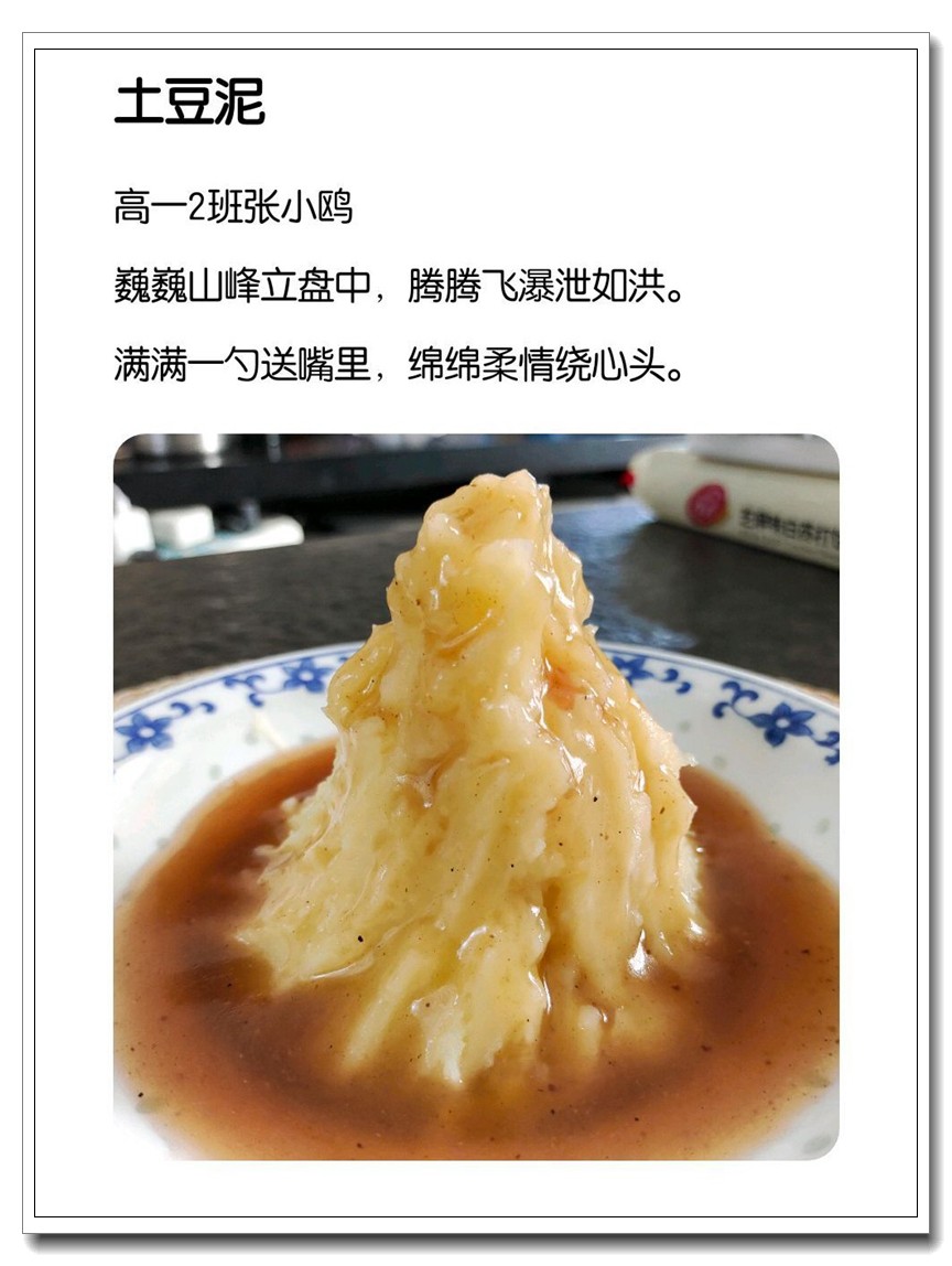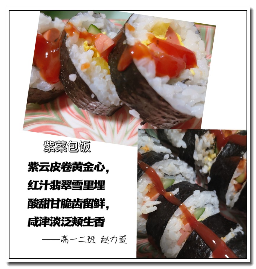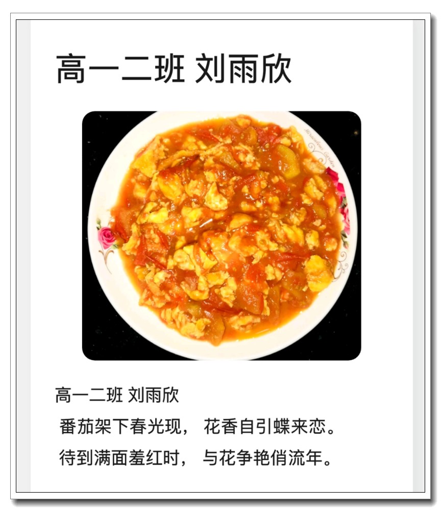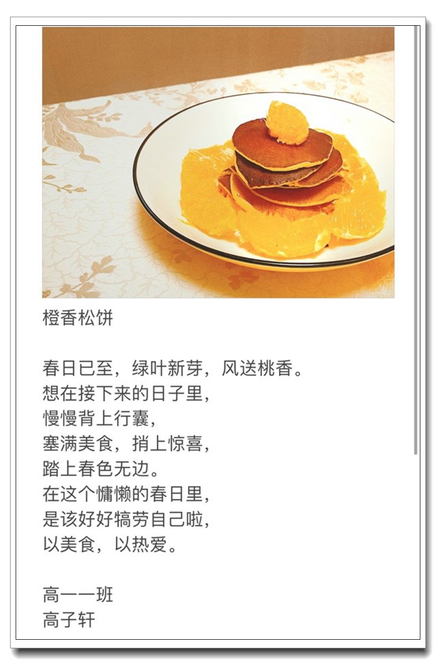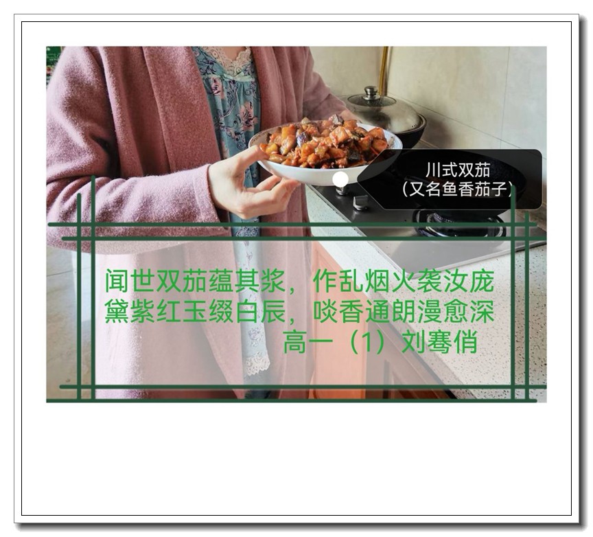 为落实五育并举教育理念和学校提出的打造线上高品质课堂要求,创新学习方式提升学生语文学科核心素养,高一语文组的宋立国老师结合线上教学和居家生活的实际情况,在所任教的高一(1)班和(2)班布置了“食中有诗 诗中有食”特色作业,让学生利用家中食材制作各色菜肴,并自己创作诗句对制作的菜肴进行文学性描述。同学们踊跃参加,精心制作,八仙过海,各显神通,精美的家常菜肴、个性的创意菜品搭配自创的清新雅致诗句,让人看来津津有味,读来回味无穷。
