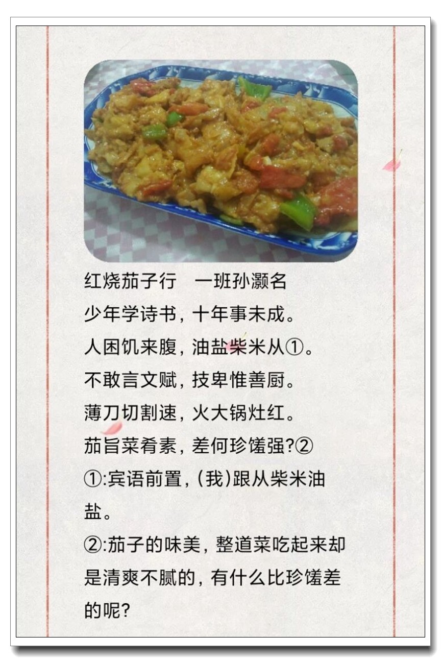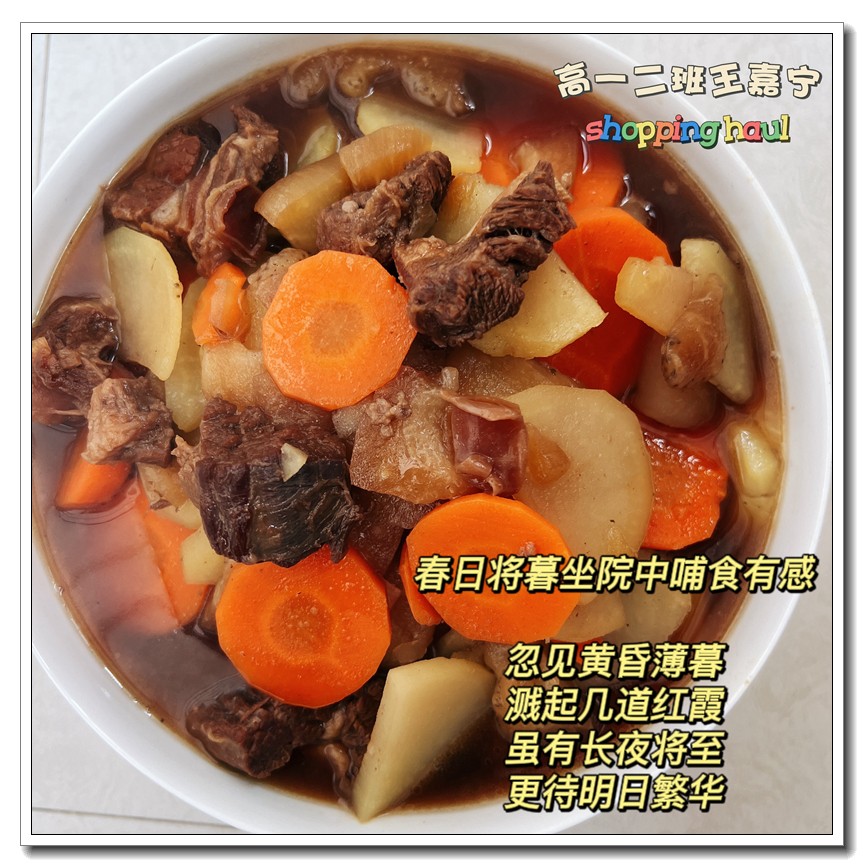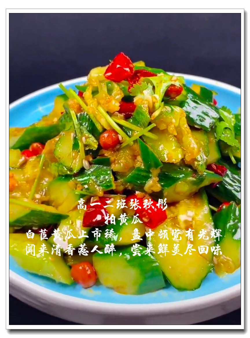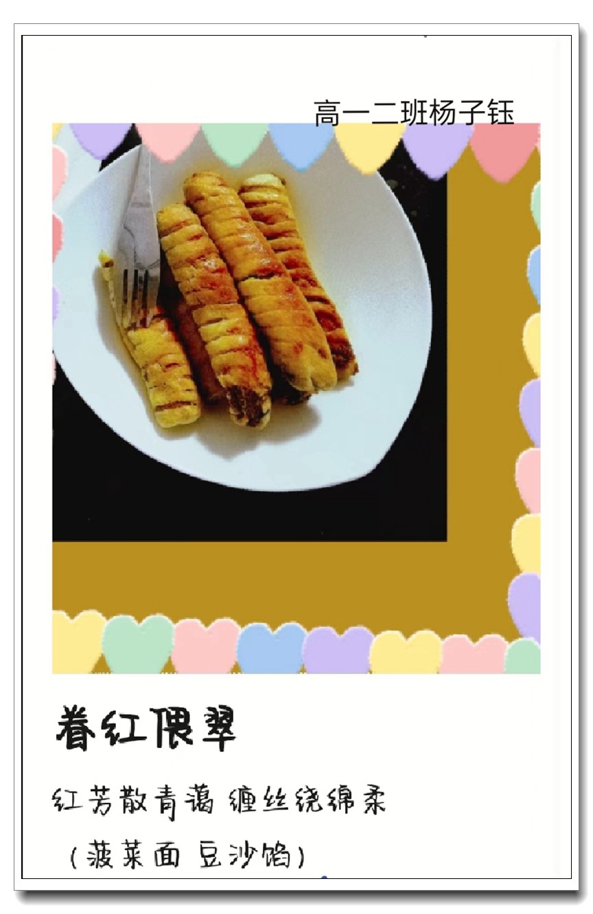 为落实五育并举教育理念和学校提出的打造线上高品质课堂要求,创新学习方式提升学生语文学科核心素养,高一语文组的宋立国老师结合线上教学和居家生活的实际情况,在所任教的高一(1)班和(2)班布置了“食中有诗 诗中有食”特色作业,让学生利用家中食材制作各色菜肴,并自己创作诗句对制作的菜肴进行文学性描述。同学们踊跃参加,精心制作,八仙过海,各显神通,精美的家常菜肴、个性的创意菜品搭配自创的清新雅致诗句,让人看来津津有味,读来回味无穷。