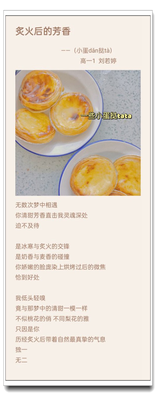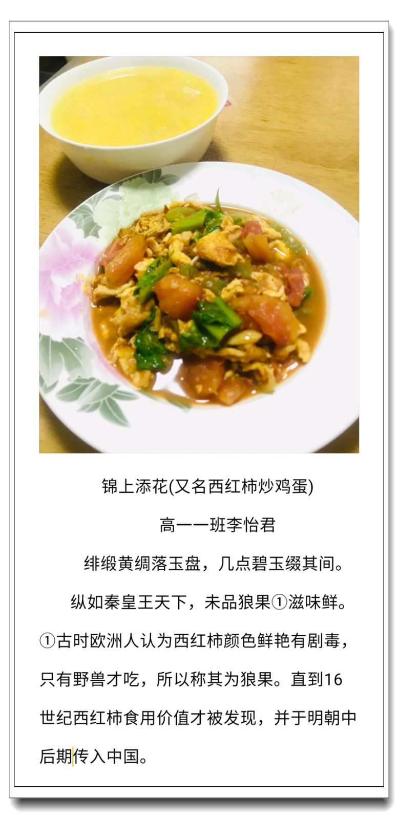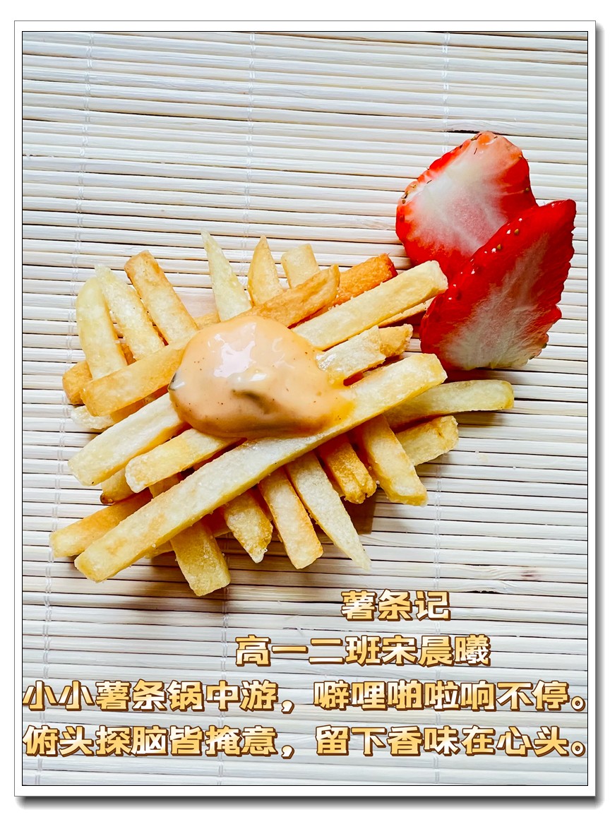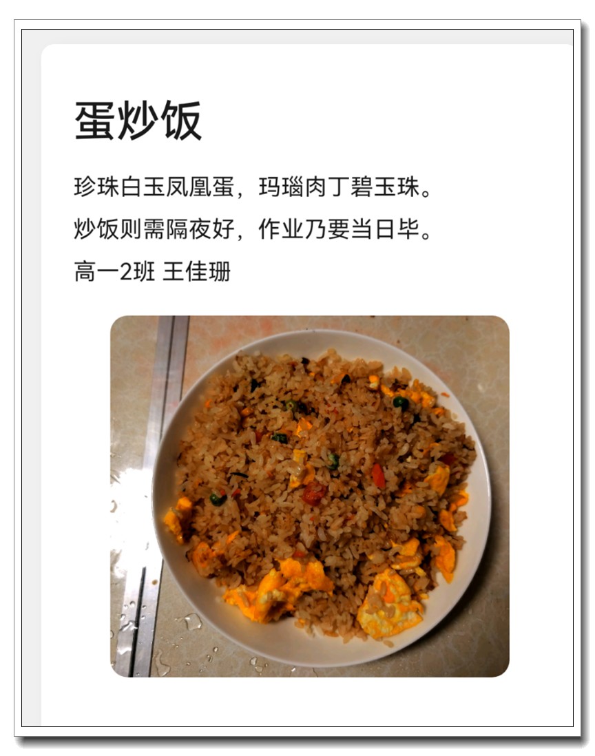 为落实五育并举教育理念和学校提出的打造线上高品质课堂要求,创新学习方式提升学生语文学科核心素养,高一语文组的宋立国老师结合线上教学和居家生活的实际情况,在所任教的高一(1)班和(2)班布置了“食中有诗 诗中有食”特色作业,让学生利用家中食材制作各色菜肴,并自己创作诗句对制作的菜肴进行文学性描述。同学们踊跃参加,精心制作,八仙过海,各显神通,精美的家常菜肴、个性的创意菜品搭配自创的清新雅致诗句,让人看来津津有味,读来回味无穷。