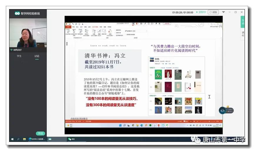 芬芳四月季,读书好时节。为了激发我校全体师生的读书热情,引领大家多读书、读好书,学校开展了形式多样的主题活动。2022年4月23日,是第27个世界读书日,应我校邀请,清华大学图书馆张秋副馆长,为高一高二年级的全体同学做了一场主题为“爱上阅读 爱上成长”的线上讲座。讲座由我校图书馆娄燕馆长主持,周燕来书记、王卫国校长、耿立平副校长、佘念利副校长以及高一、高二全体语文教师聆听了本次讲座。