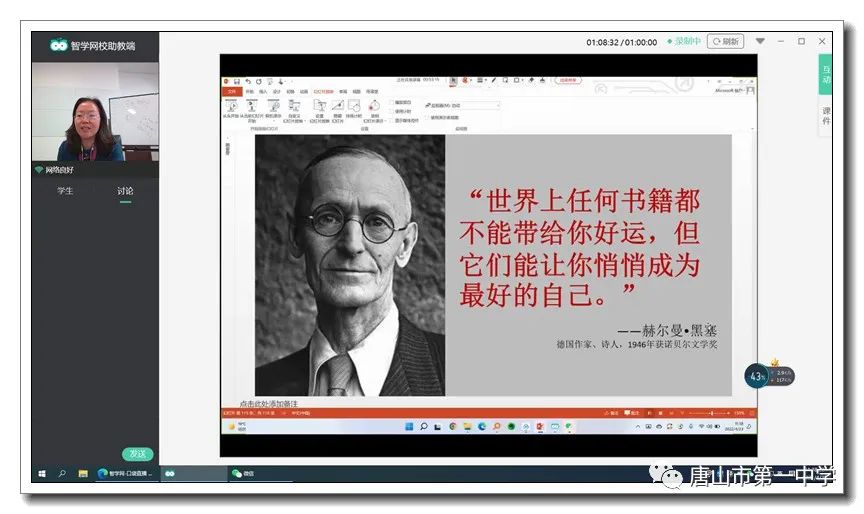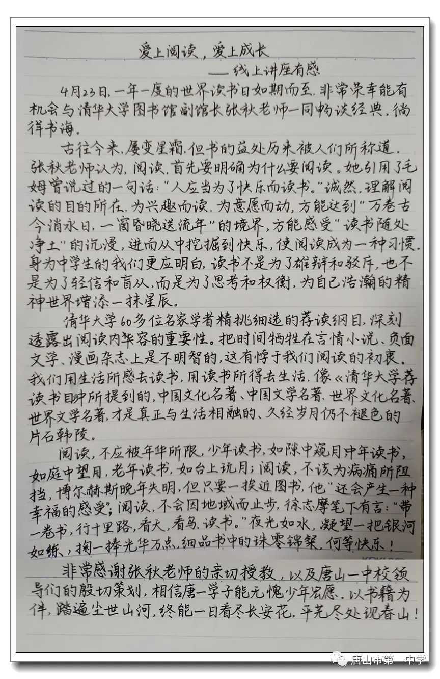 作为一名“读书人”,我非常有幸能在世界读书日这一天听到张老师的讲座。老师关于读书意义和读书方法的独到见解,给了我深切的启发,同时也不禁让我为自己那匮乏的阅读量和对那名著忽略的态度而感到惭愧。回想过去的几年,自己阅读《西游记》《水浒传》等名著更多地是为了应付中考,何时曾静下心来去体会它们背后蕴含的珍贵的思想?我和那些被我匆匆翻过的书页只是有了“数面之缘”,而没有灵魂上的沟通。现在想来,为了不辜负先贤,不辜负自己,我的确应该时时重温这些名著。唯有如此我才有可能跨越几十几百甚至几千年的时光与先哲对话,做与他同归的那位“斯人”。也愿我们都能发现名著,珍视名著,精读名著,做先贤在当代的灵魂之交。(高一16班白宸旺)今天是世界读书日,也是大文豪莎士比亚的辞世纪念日。书是人类进步的阶梯,善读书,可以于书中发现“黄金屋”;善读书,可以在你生命的每一时刻带给你勇气和希望。善读书,是最低成本的自我增值方式。善读书,能汲取经验给命运带来积极影响。在这个知识爆炸的时代,我们青年唯有读书,才能更好地提升自己。正如张秋老师最后在讲座中所说:“世界上任何书籍都不能带给你好运,但它们能让你悄悄成为最好的自己。”(高一16班陈刘一凡)一个人的精神发育史就是他的阅读史;一个民族的精神境界取决于这个民族的阅读水平;一个书香充盈的城市,才能拥有美丽的精神家园;一个没有阅读的学校永远不可能有真正的教育。如果说行万里路拓展了我们生命的宽度,那么,读万卷书便沉淀了我们生命的厚度。阅读诚然重要,但更重要的是,懂得如何阅读,听了张秋老师的讲座后,我认识到了,在如今浮躁的社会环境下,阅读作为沉淀我们心灵的最佳方式,应当得到应有的重视——体会深阅读之美。深阅读似茗,需细品,需在风定人静的夏夜,想起那“留得残荷听雨声”的闲情;需在金风袅袅的黄昏,想起那“帘卷西风,人比黄花瘦”的婉约;需在浩浩江水边,想起那“大江东去,浪淘尽”的豪放。深阅读,是一种更贴近心灵的阅读,世界仿佛只剩下了书,只剩下了自己和作者的喁喁私语。让我们体会深阅读之美,在“人间有味是清欢”中受到心灵的净化与感悟。(高二13班郑竣胧)醉逐飞花影,静咏书卷情。在第二十七个世界读书日,唐山一中的同学们齐聚线上,与张秋老师共同赶赴春日邀约,体味阅读的力量。诚如张老师所言,阅读的力量就是成长的力量。它如同四月天的惠风,在生命的角落默默陪伴,倾注着光阴的深情,予我们的灵魂以雨露滋长。我们也将借这份力量迎击疫情挑战,让阅读赋予生活一份厚重的寄托,在挑战中结成青春的硕果。(高二18班杨一诺)