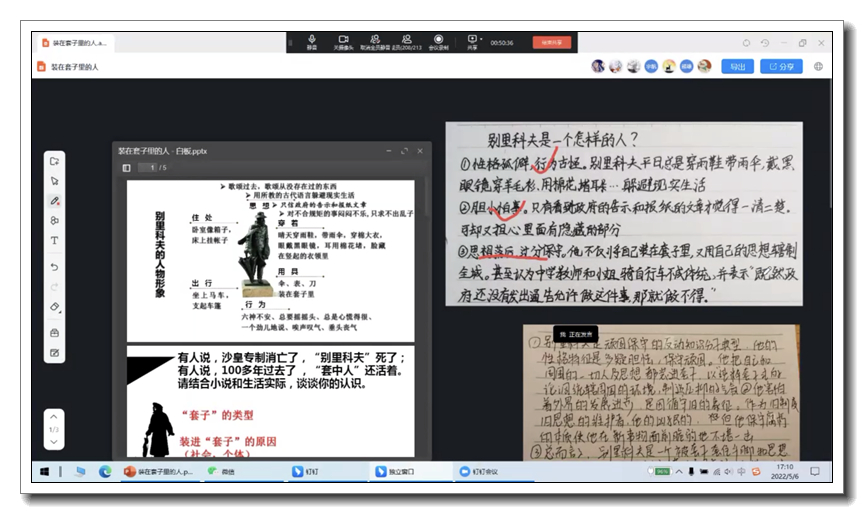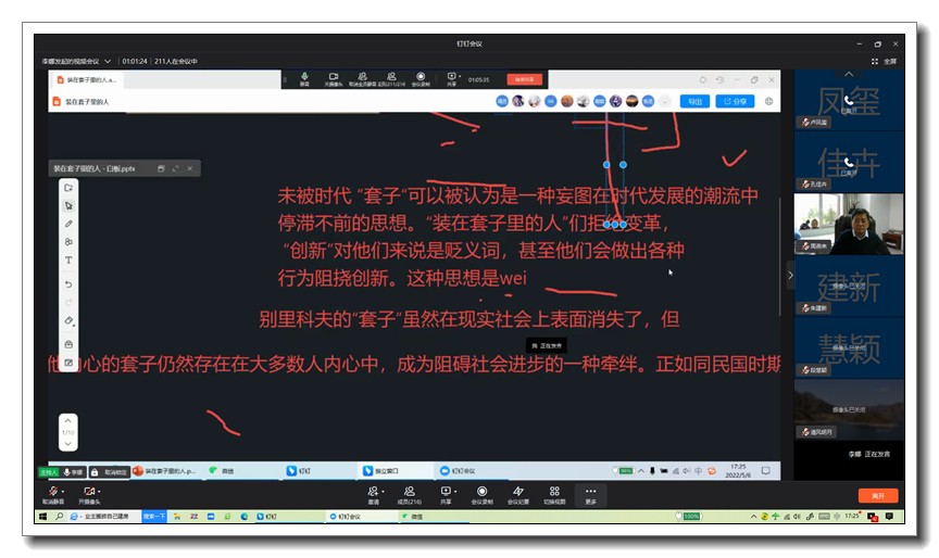 在本次教研活动中,高一语文组李娜老师为大家上了一节非常精彩的线上展示课。李老师授课的内容是契诃夫的小说《装在套子里的人》。本节线上课内容充实,学生参与度高,给各位听课老师带来很多启发。课堂由富有深意的小视频引入激发了同学的学习兴趣,课堂中用问题启发学生思考,充分挖掘平台功能提高课堂实效,比如在讨论环节,李老师利用钉钉白板,让同学们积极发言,展示自己的思考成果。本节课在新理念导引、新技术支撑下,对如何打造高品质线上课做了有意义的探索,具有很强的引领示范作用。