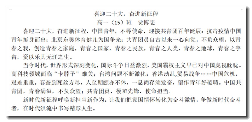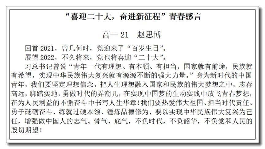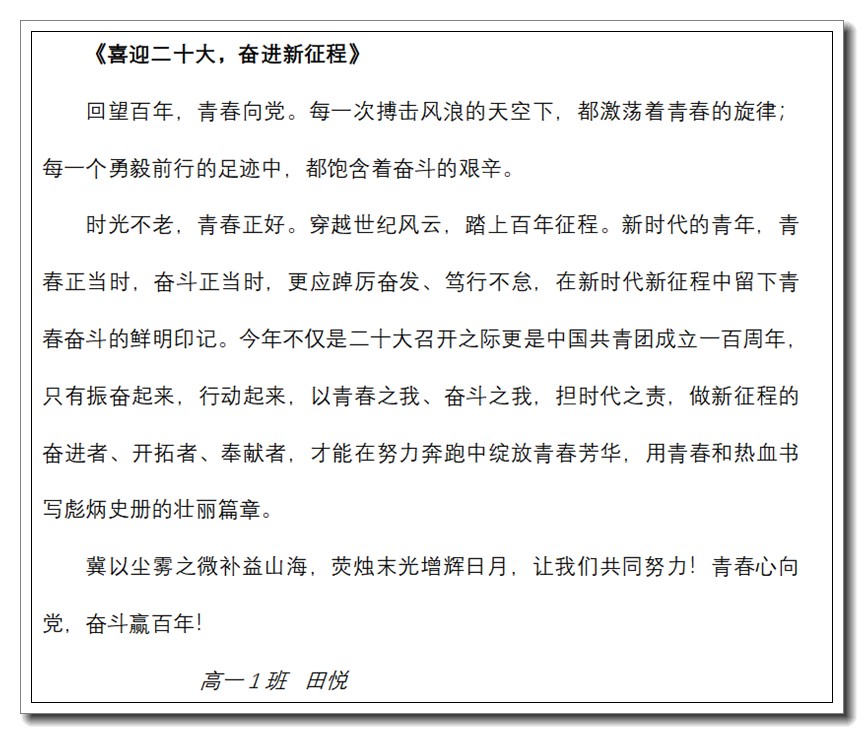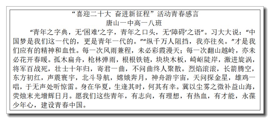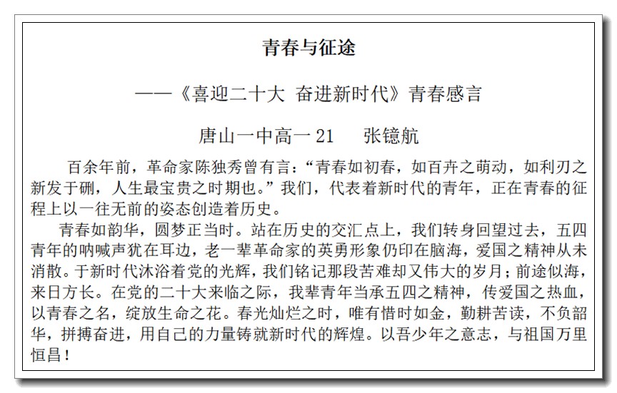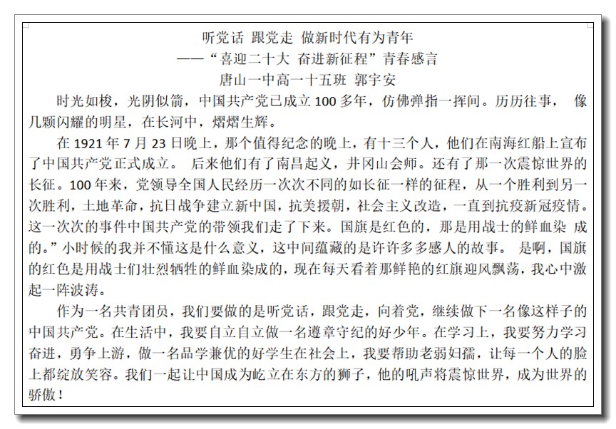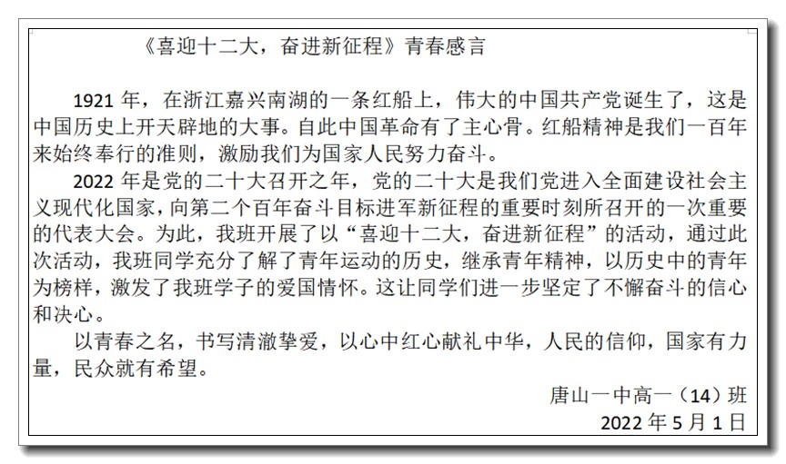 为迎接党的二十大,结合庆祝建团100周年,落实立德树人根本任务,培养德智体美劳全面发展的社会主义建设者和接班人,唐山一中团委于五月初举办“喜迎二十大,奋进新征程”之青春感言征文活动,以实际行动迎接党的二十大胜利召开。高一年级全体同学参与了本次活动。此次征文活动以班级为单位开展,由各班负责人收集作品,同学们踊跃参加活动。经班级组织初评,推荐近20名同学的作品至校团委进行评选。参赛学生紧紧围绕“喜迎党的二十大”这一主题,将当代学生朝气蓬勃、奋发进取的精神风貌流淌至笔尖下,渗透进文字中。奋斗百年路,启航新征程。奋斗百年路,启航新征程。本次征文活动的举办进一步贯彻习近平新时代中国特色社会主义思想,使同学们自觉弘扬伟大建党精神,同时团结引领唐一学子坚定跟党走、建功新时代。