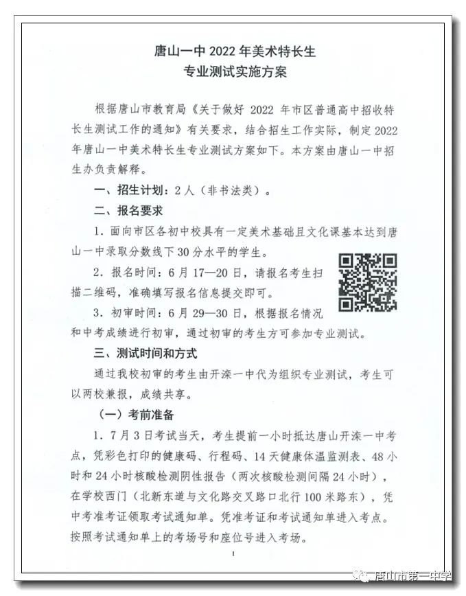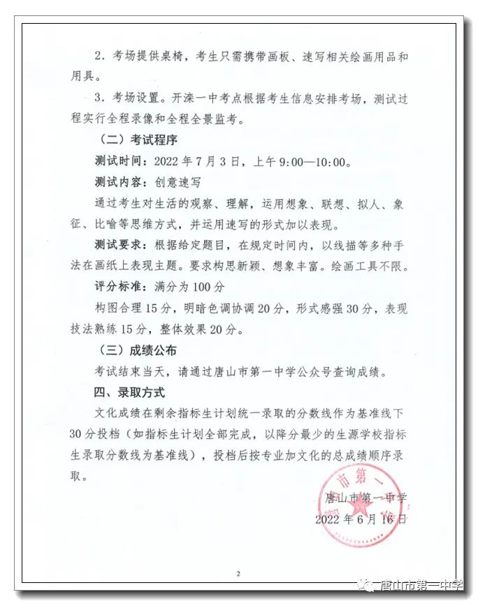 唐山一中2022年美术特长生专业测试实施方案 - 唐山市第一中学