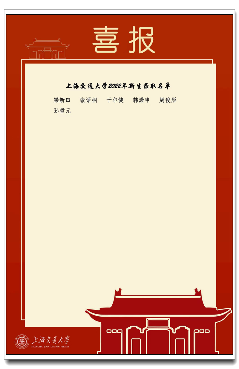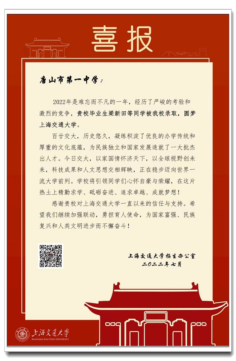 近日,上海交通大学向唐山一中发来喜报,祝贺我校韩潇申、孙哲元、梁新田、张语桐、于尔健、周俊彤等6位优秀学子在经历了严峻的考验和激烈的竞争后圆梦上海交大。我校特向6位同学及他们的班科任老师表示热烈祝贺!也祝愿同学们心怀自豪与荣耀,在上海交通大学的广阔天地中精勤求学、砥砺奋进、追求卓越、成就梦想!