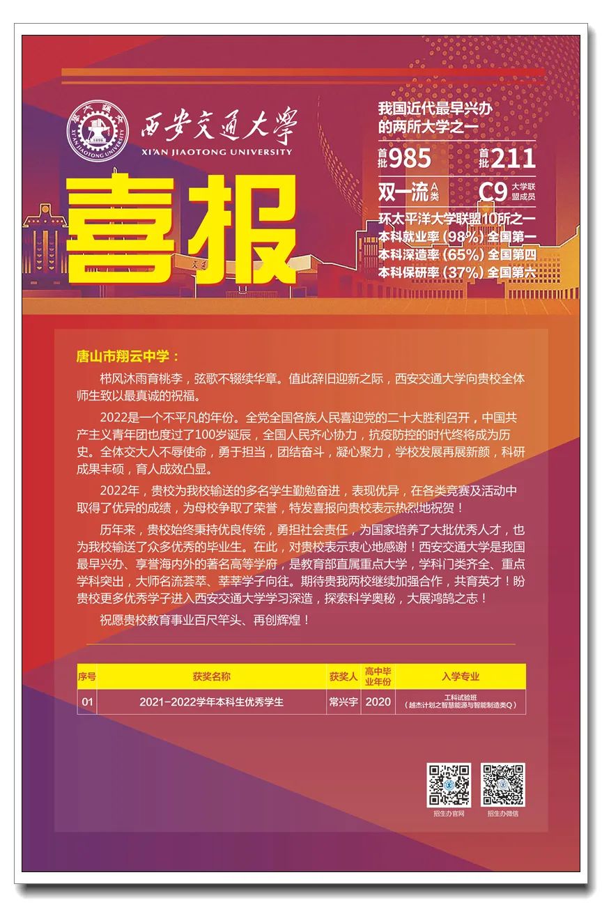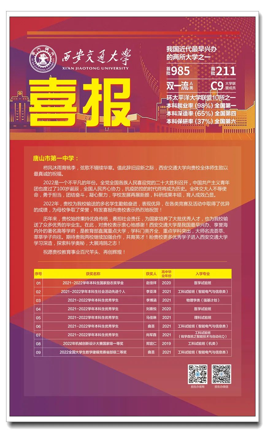 新年伊始,西安交通大学向我校发来喜报,祝贺我校优秀毕业生赵佳祥、李亚泽、李博涵、刘熹悦、马佳琳、曲圣、尚军酉、郑宜仁、常兴宇等9位同学在2021—2022学年获得包括国家励志奖学金、本科生优秀学生、机械创新设计大赛国家级一等奖、全国大学生数学建模竞赛省部级二等奖在内的多项奖励,我校特向9位同学及他们的班科任老师表示热烈祝贺!向辛勤培养他们的西安交通大学表达由衷的感谢!并预祝同学们在新的一年勤勉奋进,再展宏图!