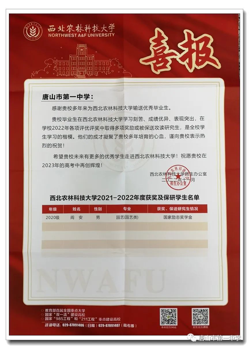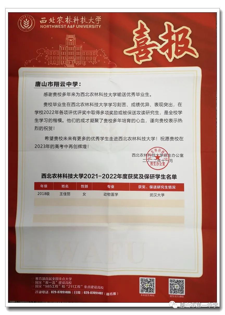 近日,西北农林科技大学向我校发来喜报,祝贺我校优秀毕业生阎安同学获得国家励志奖学金,王佳丽同学即将进入武汉大学动物医学专业攻读硕士学位。我校特向两位同学及他们的班科任老师表示热烈祝贺!向精心培养他们的西北农林科技大学表示衷心感谢!并预祝两位同学在未来的学习生活中厚积薄发,砥砺前行,再传佳音!
