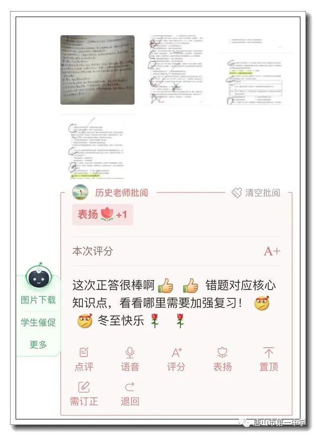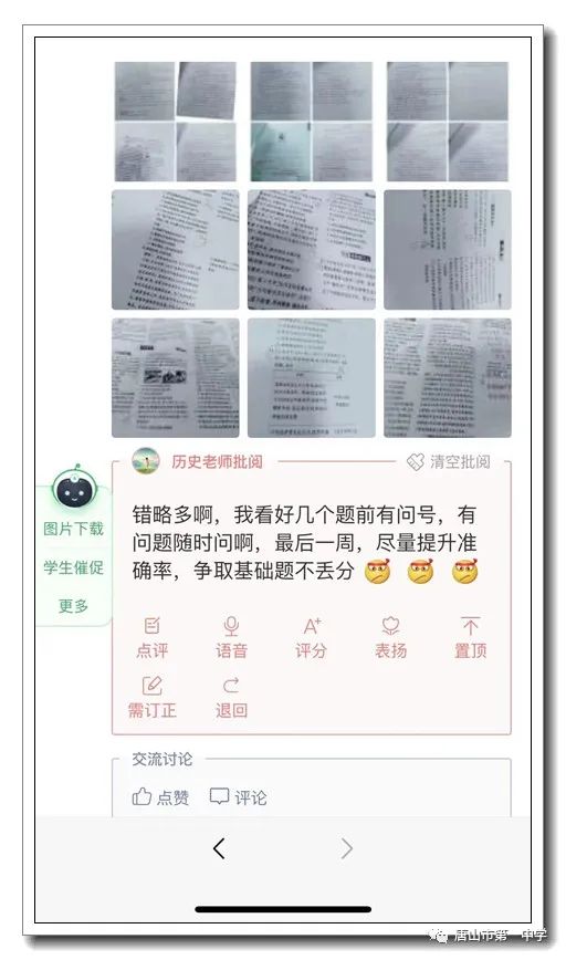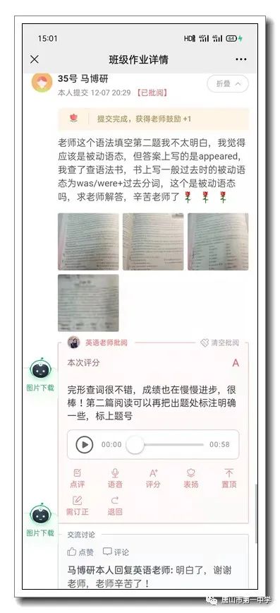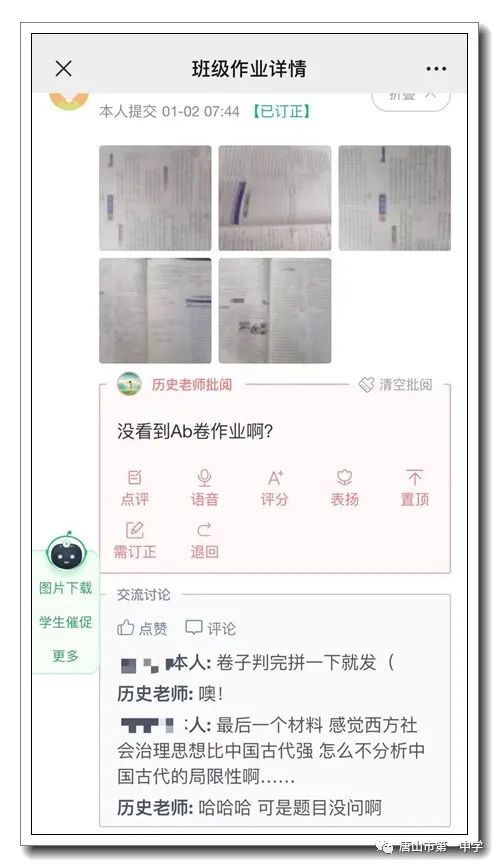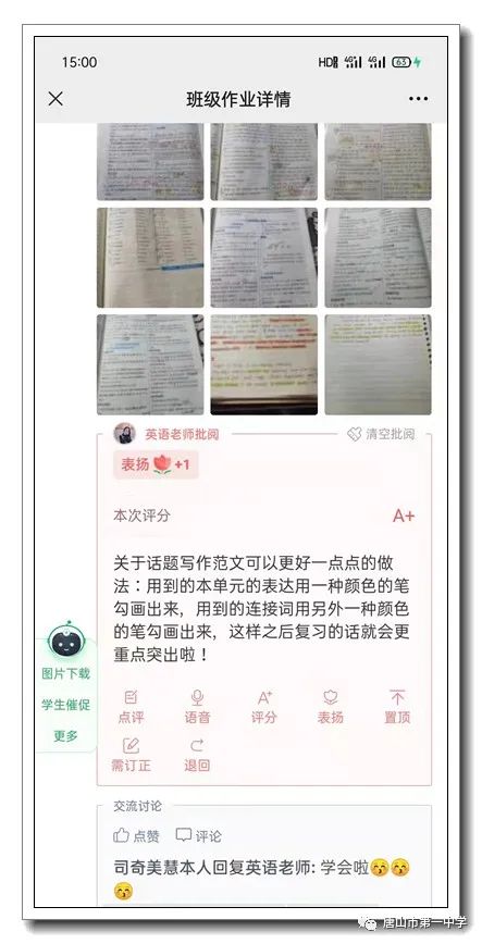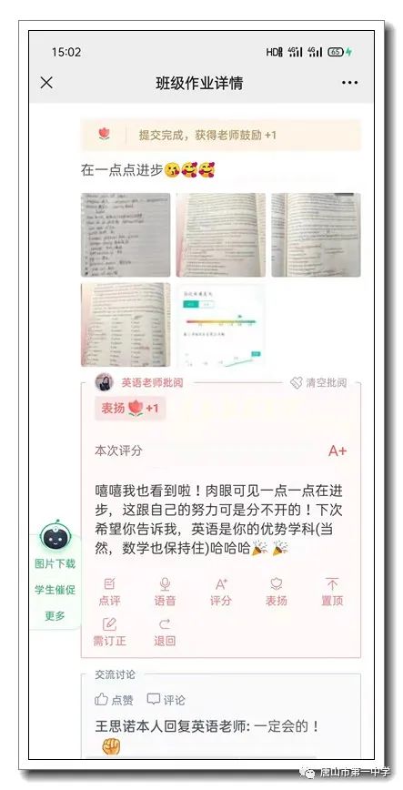 杜婧超老师检查作业细致认真,在提交作业时候与学生互动频繁,有鼓励有建议,学生作业有修改有订正。
