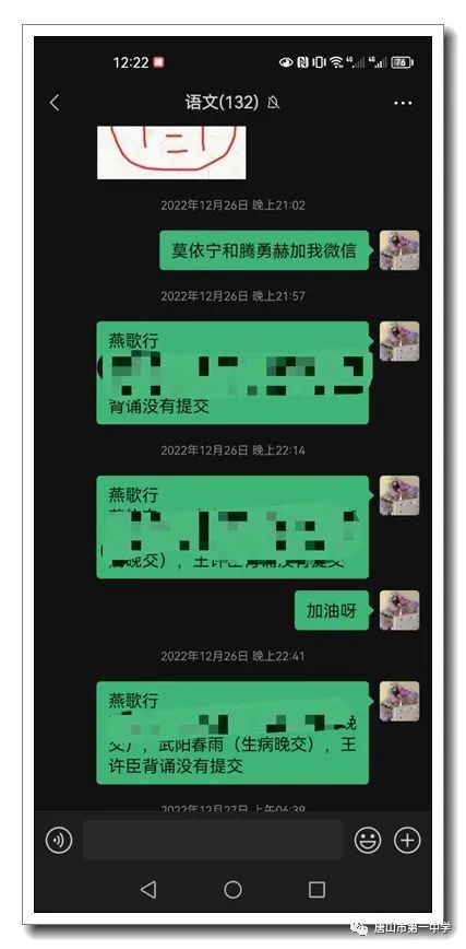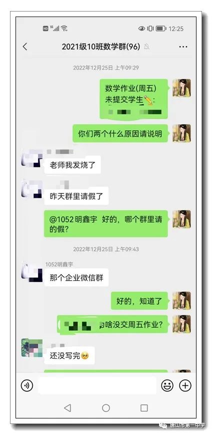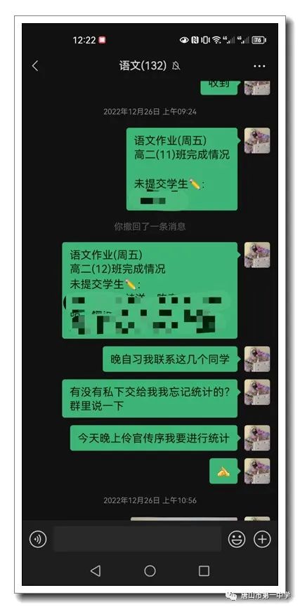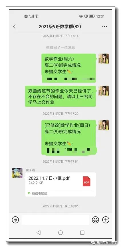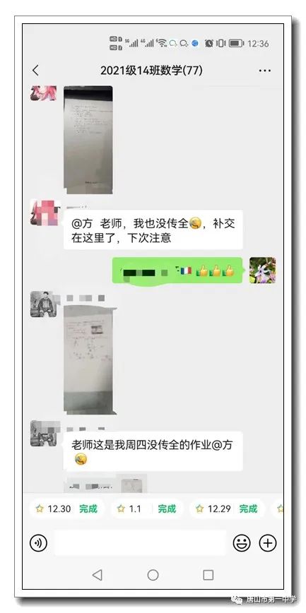方丽宏老师用智学网检查作业,每天在数学群通报作业检查情况,对于作业交不全的同学,督促其在作业群补交,严爱兼施。