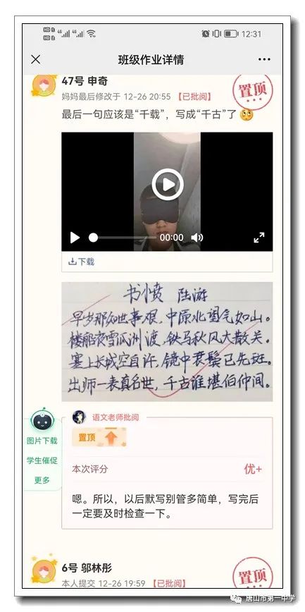 李娜老师根据语文学科特点,让学生发背诵视频并默写,及时纠正,以保证英才班学生不在默写的拿分点失分,点点滴滴全是对学生的无限热爱。