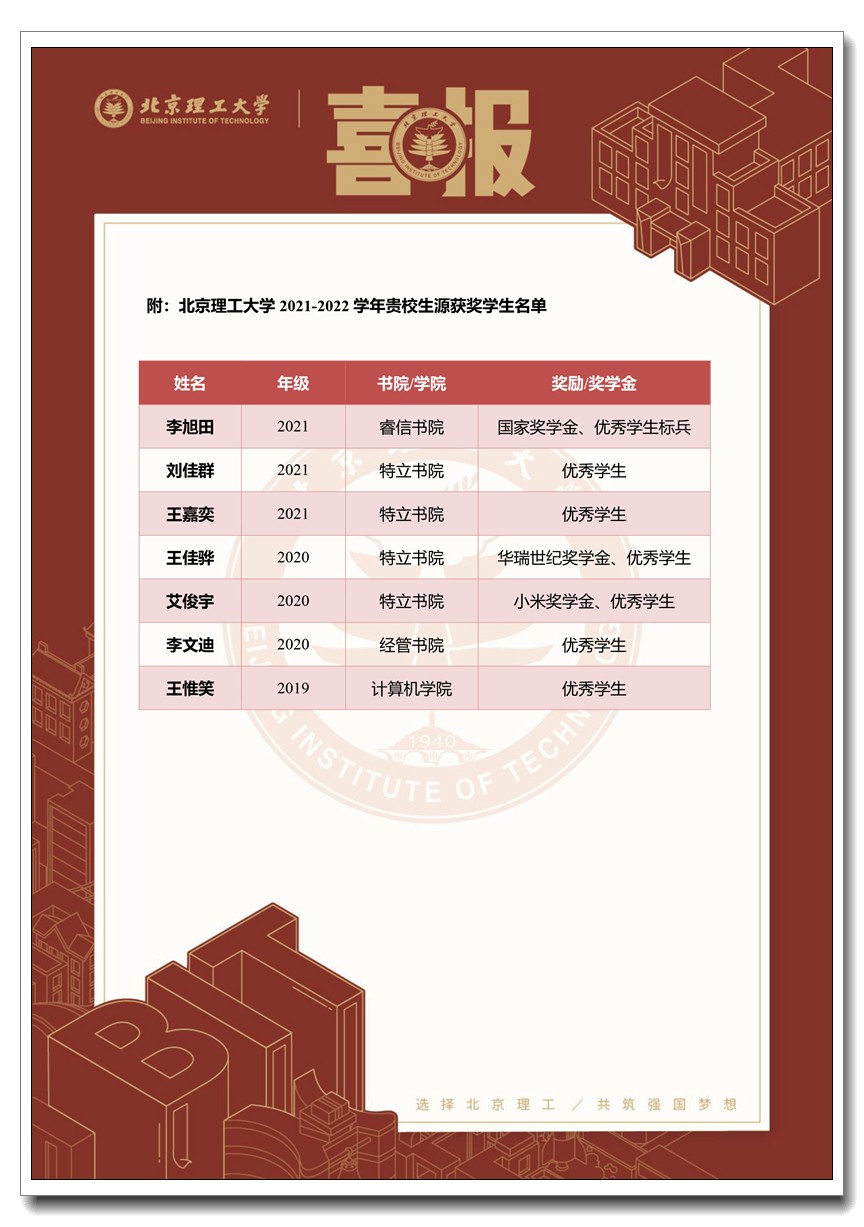 近日,北京理工大学向我校发来喜报,祝贺我校优秀毕业生王馗沣、王惟笑、王禹然分别获得北京理工大学车辆工程专业、数据科学与大数据技术专业及徐特立英才班保研资格,我校特向3位同学及他们的班科任老师表示热烈祝贺!向引领同学们不断深入学习的北京理工大学表示衷心感谢!祝愿3位同学在未来的学习中恪守初心,攻坚克难,笃行致远,再创佳绩!