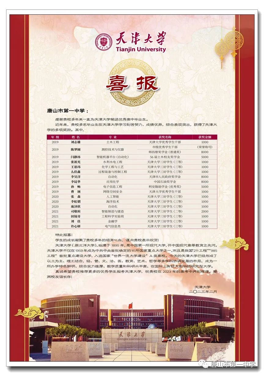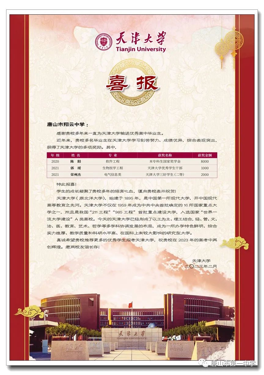 近日,天津大学向我校发来喜报,祝贺我校优秀毕业生刘志雄、陈梦圆、陈阳、郭瑷等20位同学获得天津大学优秀学生干部、市级优秀学生干部、天津大学三好学生等多项荣誉,我校特向20位同学及他们的班科任老师表示热烈祝贺!向引领他们不断提升的天津大学表示衷心感谢!并祝愿同学们踔厉奋发,笃行不怠,更上层楼!
