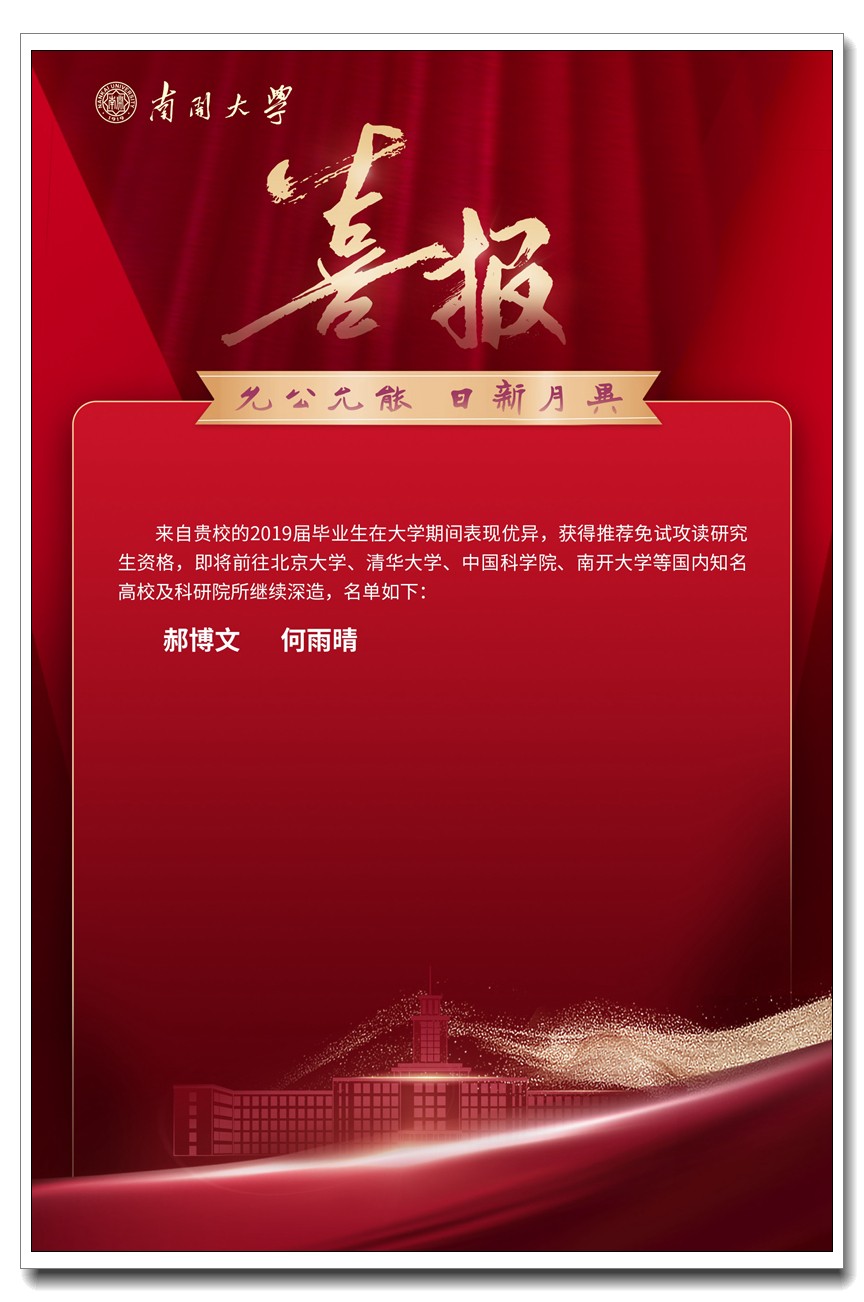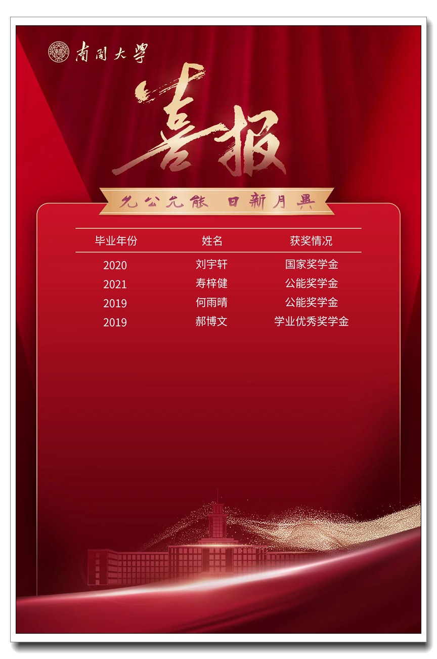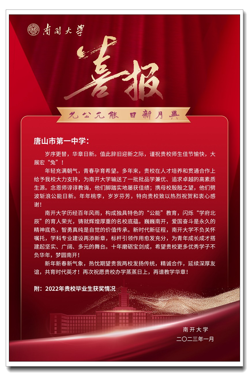 近日,南开大学向唐山一中发来喜报,祝贺我校优秀毕业生刘宇轩获得国家奖学金,寿梓健、何雨晴获得公能奖学金,郝博文获得学业优秀奖学金。另外,郝博文、何雨晴两位同学获得推荐免试攻读研究生资格,即将在南开大学开启新的深造之旅。我校特向4位同学及他们的班科任老师表示热烈祝贺!向精心培养他们的南开大学表示诚挚感谢!祝愿同学们锐意进取,厚积薄发,再传佳音!