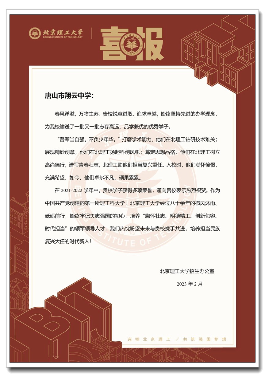北京理工大学向我校发来喜报,祝贺我校优秀毕业生李旭田、刘佳群、王嘉奕、王佳骅、艾俊宇、李文迪、王惟笑、韩宜彤、伦伊玮等9位同学在2021至2022学年获得包含国家奖学金、优秀学生等奖项在内的多项荣誉,我校特向9位同学及他们的班科任老师表示热烈祝贺!向给予他们精心培养的北京理工大学表示诚挚感谢!并祝愿同学们在新的一年中厚积薄发,蓄力前行,再传佳音!