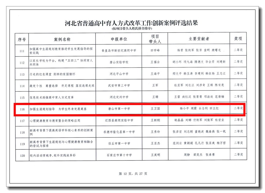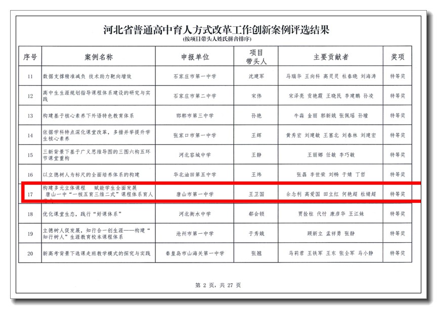 在新时代教育教学中,唐山一中致力于课程开发与实施,形成了具有本校特色的育人课程体系,为百年名校创新发展提供了有效途径。2023年5月,在河北省普通高中育人方式改革工作创新案例评选中,我校的《构建多元立体课程 赋能学生全面发展——唐山一中“一核五育三维二式”多元课程体系育人范式》获得特等奖,全省共评选出特等奖20项。同时,《加强生涯规划指导 为学生终身发展奠基》也获得了案例评选二等奖。