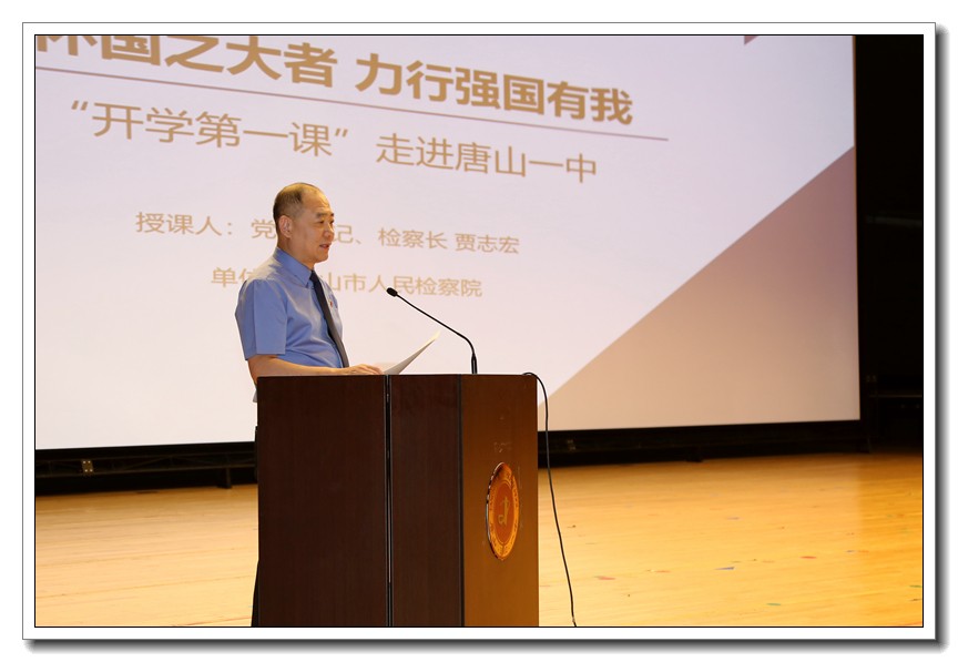 法治知识是高中阶段的必修功课,也是步入社会必备的行囊,作为高中生要知法、懂法、守法,扣好人生第一粒扣子。2023年9月5日下午我校法治副校长、唐山市人民检察院党组书记、检察长贾志宏同志走进校园,为高一全体学生开启新学期“法治第一课”。唐山市教育局党组成员、副局长赵乾,市检察院党组成员、政治部主任徐超,市人民检察院检委会专职委员周春林,市人民检察院未成年人检察部主任吕超出席了本次讲座。我校党委书记周燕来、校长王卫国、纪委书记郭兴利、副校长戚兵同全体高一学生共同参加了本次讲座。