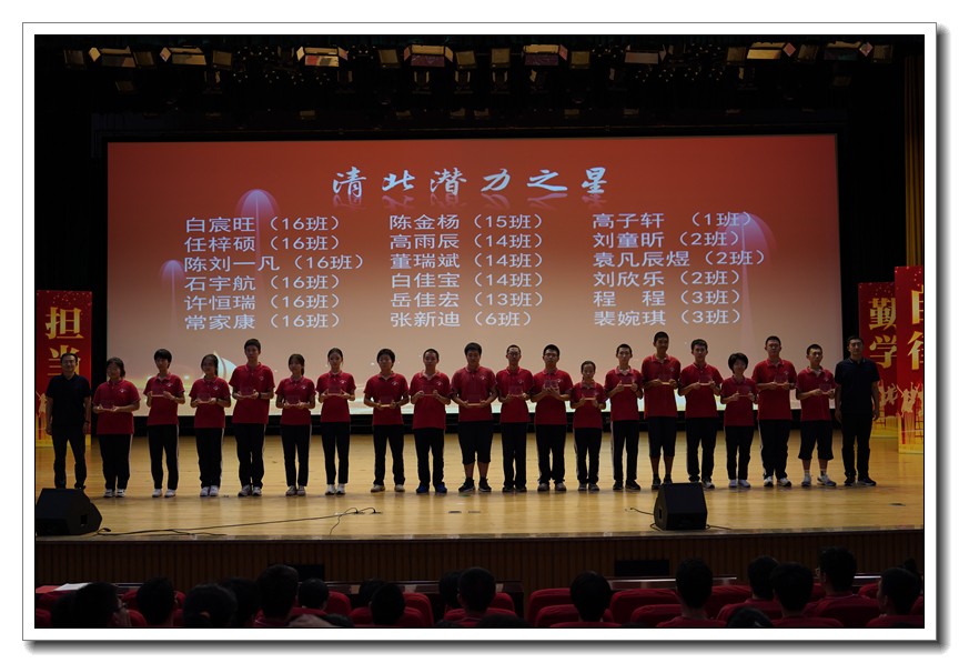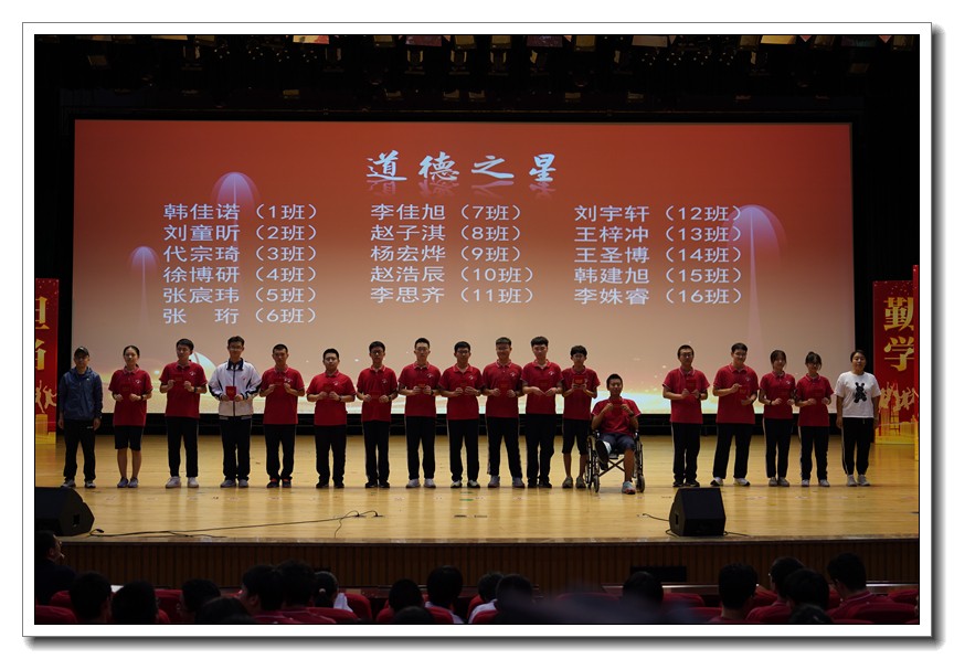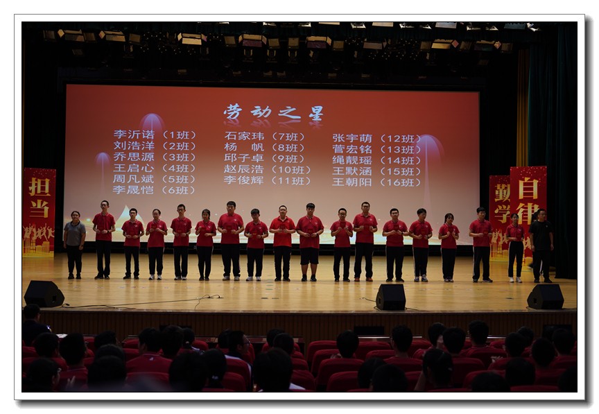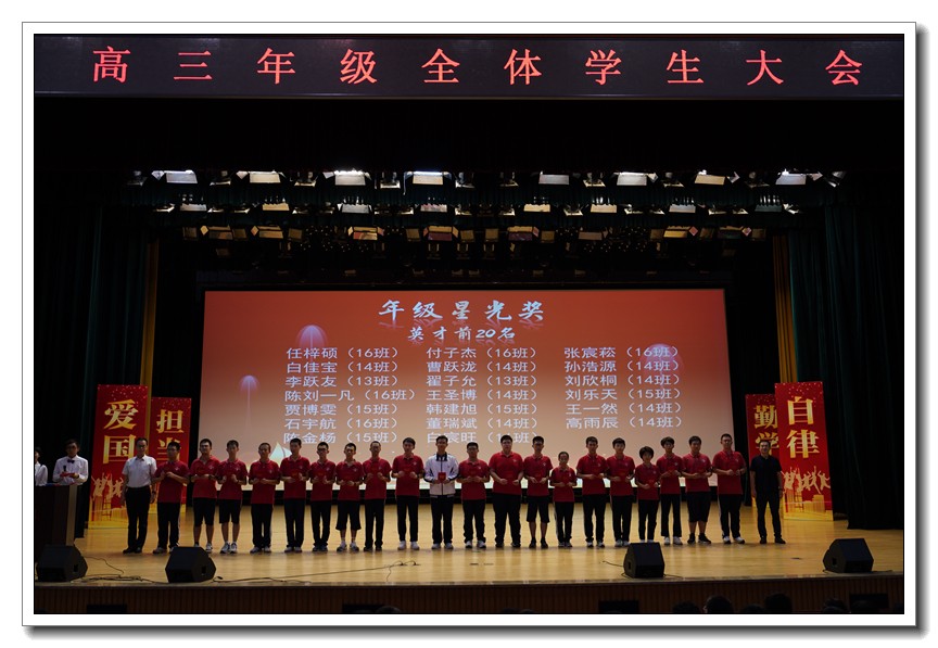 大会议程第一项:表彰先进个人和先进班集体。本次大会表彰道德之星、劳动之星、进步之星、清北之星以及年级星光奖等。