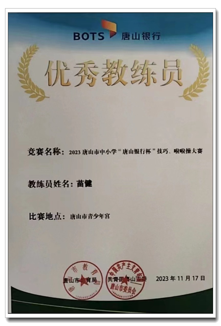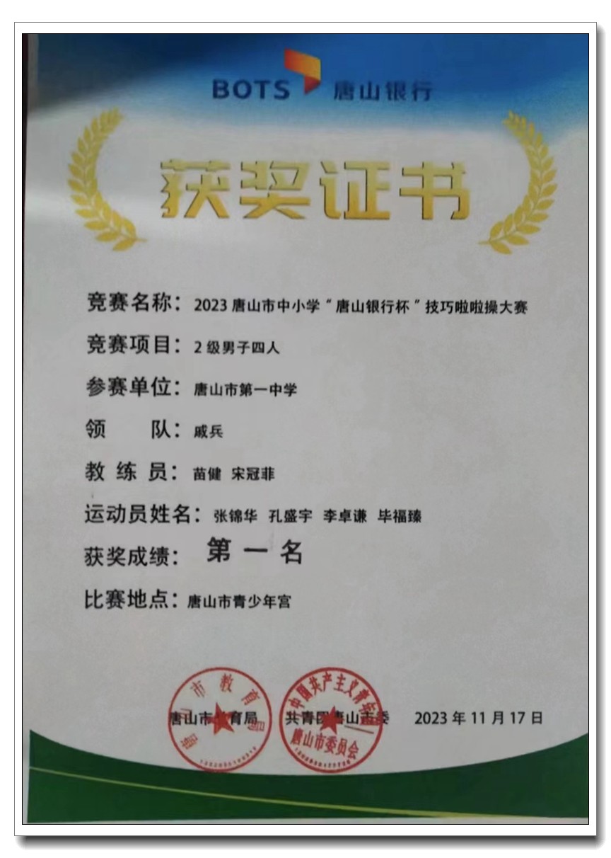 2023年11月17日唐山市中小学“唐山银行杯”技巧、啦啦操大赛在唐山市青少年宫开赛。本次比赛共有来自全市70多所学校参加比赛。我校高一(3)班张锦华、高一(4)班孔盛宇、高一(8)班李卓谦、高一(12)班毕福臻四位同学代表我校参赛,经过激烈的角逐。孩子们以自信的微笑和充满活力、富有激情的表演最终脱颖而出,喜获“技巧大集体”和“2级男子四人组”两项冠军。指导教师苗健老师获得“优秀教练员”称号。
