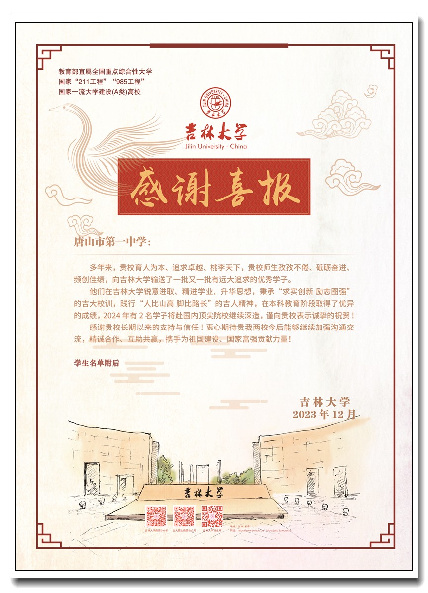 吉林大学再次向我校发来喜报 - 唐山市第一中学