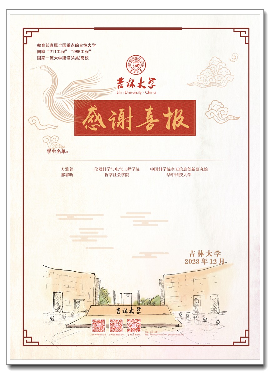 近日,吉林大学再次向我校发来喜报,祝贺我校朱俊兆、刘雨奇、方雅萱、郝睿昕等4位同学获得赴国内顶尖院校继续深造的资格。我校特向他们的班科任老师表示热烈祝贺,向给予同学们更高平台的吉大表示衷心感谢!预祝同学们在新的学习征程中砥砺前行,再放溢彩。