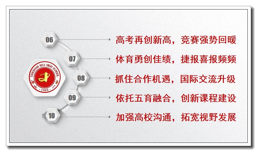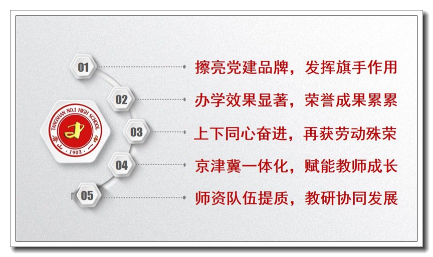在2022年河北省普通高中育人方式改革工作创新案例评选中,我校《构建多元立体课程 赋能学生全面发展 唐山一中“一核五育三维二式”课程体系育人范式》荣获特等奖。4项省市规划课题立项,5项省市规划课题结题,3项省市教研成果奖。