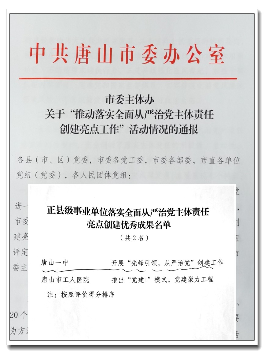 2023年我校党委被评为“唐山市优秀基层党组织”、被授予第二批“唐山市A档基层党组织”称号,报送案例被评为“全面从严治党主体责任亮点创建优秀成果”。