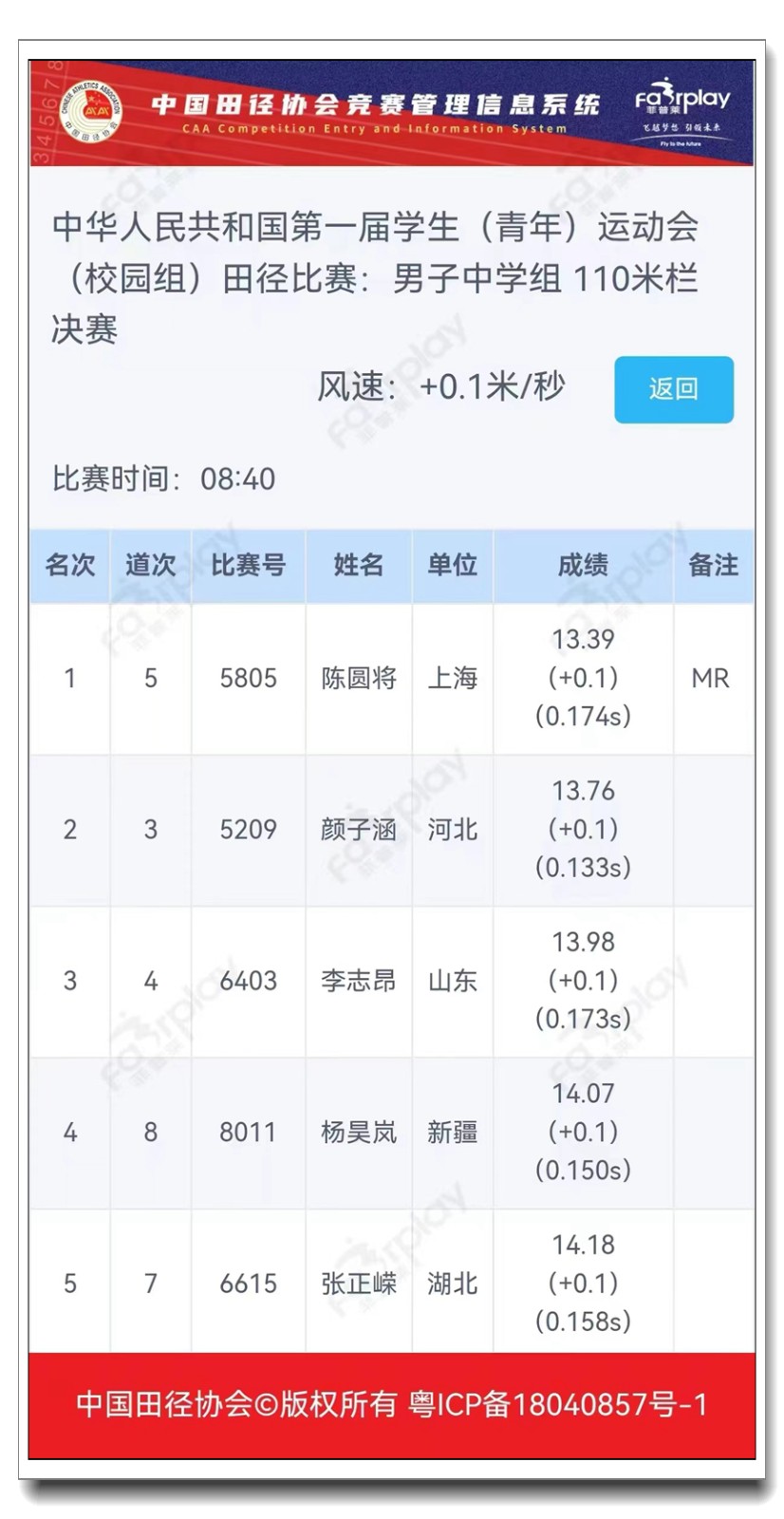 11月,在全国第一届学生(青年) 运动会中,颜子涵获男子110米栏银牌,为历年全省最好成绩。