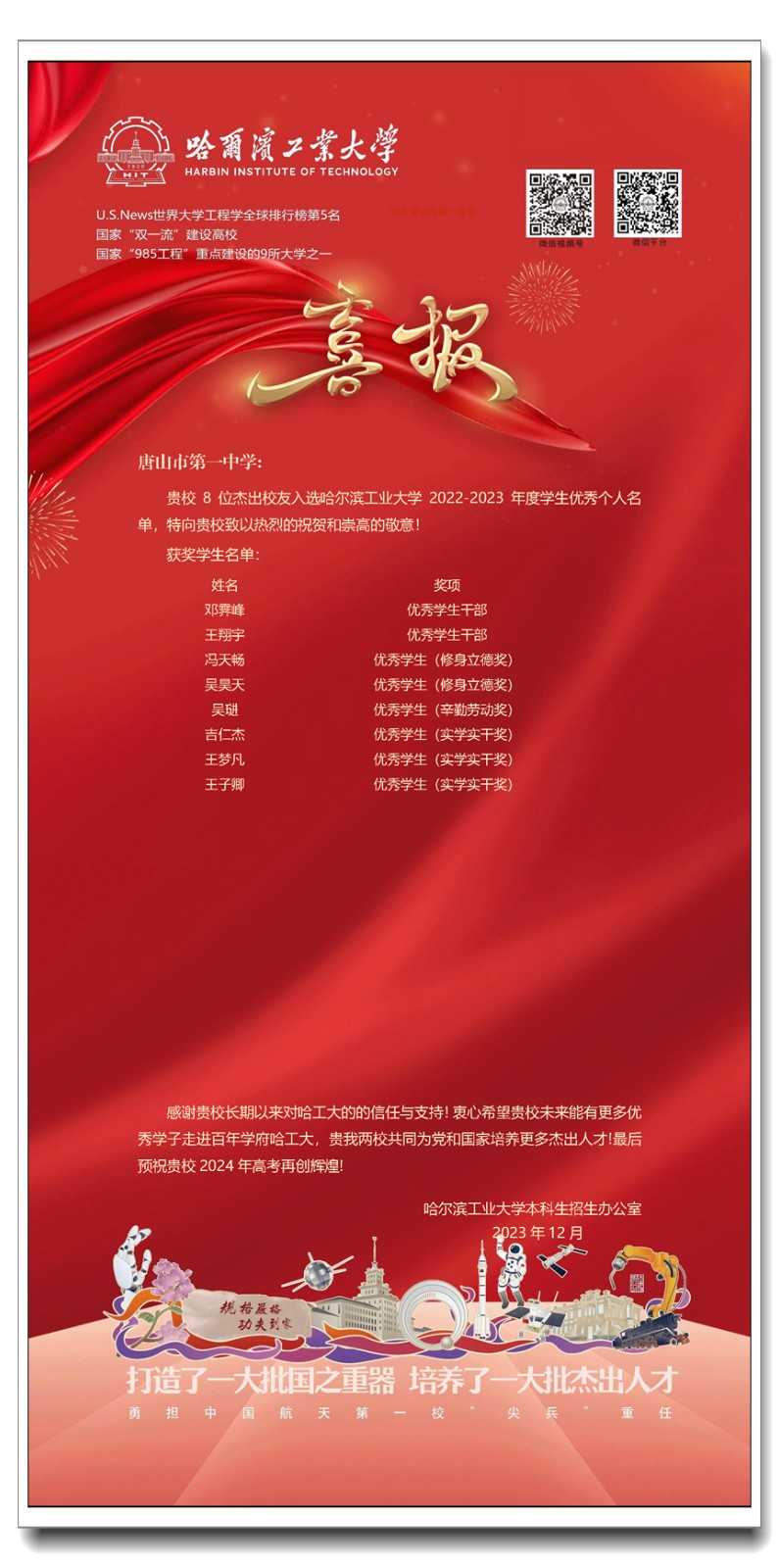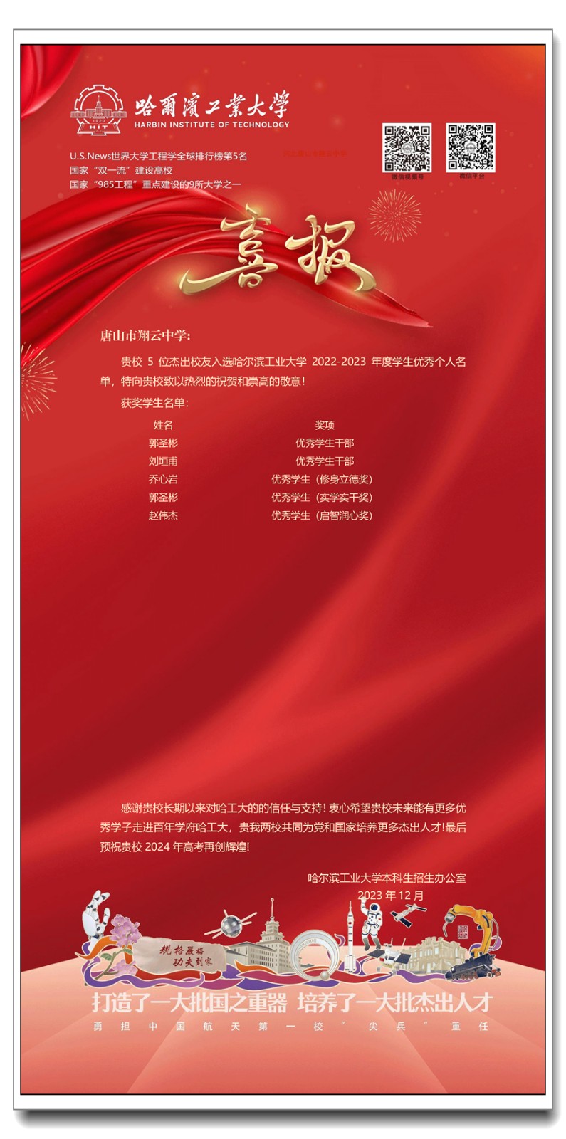 近日,哈尔滨工业大学向我校发来喜报,祝贺我校邓霁峰、王翔宇、冯天畅、吴昊天、吴琎、吉仁杰、王梦凡、王子卿、郭圣彬、刘垣甫、乔心岩、赵伟杰等12位优秀毕业生,在2022至2023学年获得优秀学生干部、优秀学生等荣誉称号共13人次,我校特向12位同学及他们的班科任老师表示热烈祝贺。向以百年底蕴涵养优良学风,为同学们提供广阔平台的哈尔滨工业大学表示衷心感谢。