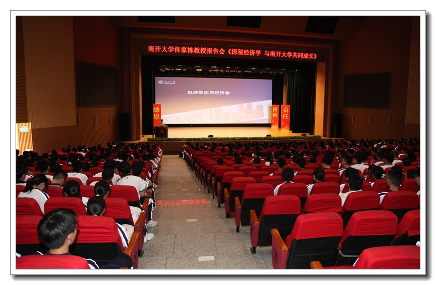 第一项议程,南开大学佟家栋教授作了《探秘经济学,与南开大学共同成长》的主题报告。佟教授基于自己深厚的专业知识,从什么是经济学、为什么要学习经济学、南开大学经济学科简介三个方面,结合与学生息息相关的高考录取、专业选择、就业前景等实际问题,用深入浅出的语言引领同学们探秘经济学。